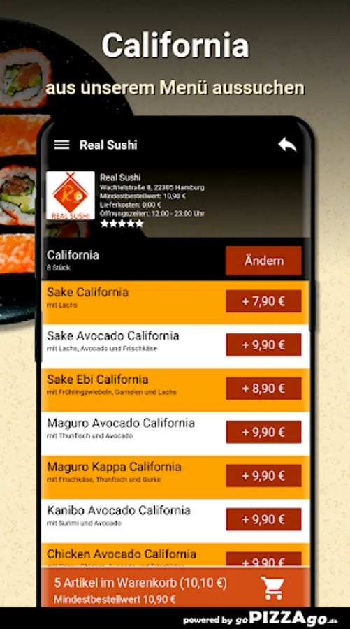 Maki Avocado, tasty Maki Pana is available at Real Sushi for € 4.90, Maki Kappa Philadelphia is available for € 5.90, and Spicy Maki Kappa is available for € 4.90. Your Real Sushi in Hamburg