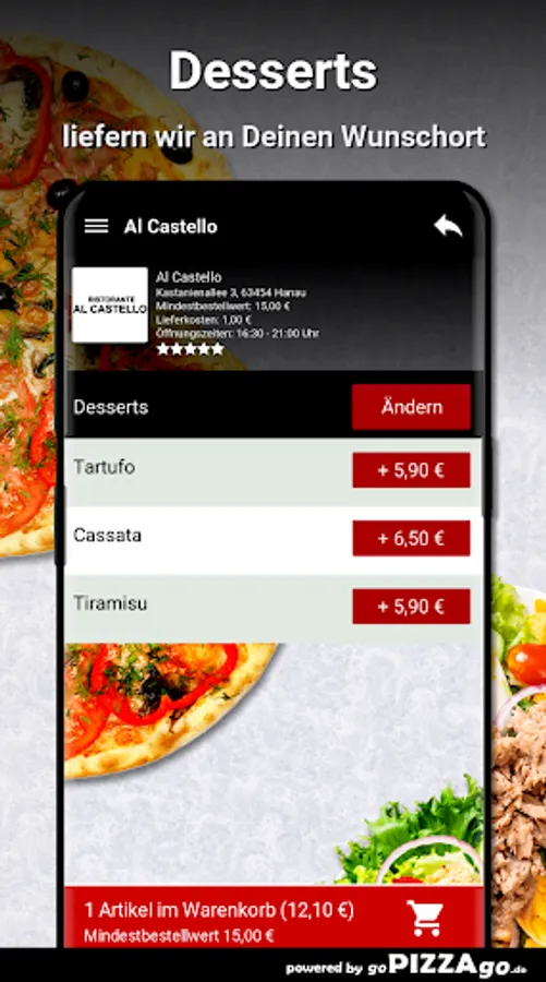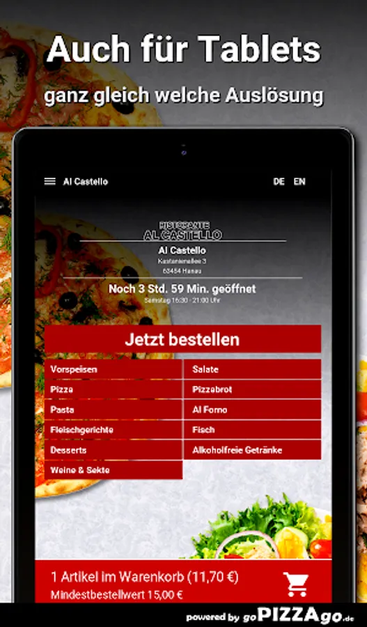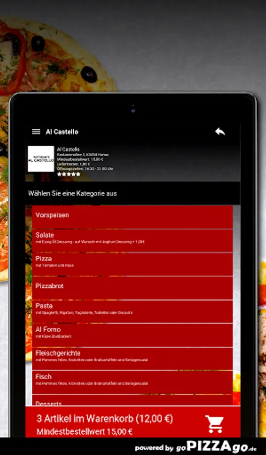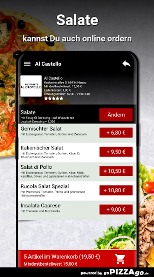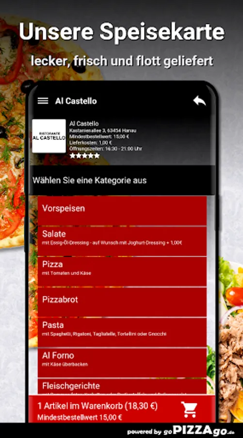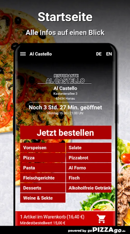 Order food online at Al Castello HanauAt Al Castello you can order meat dishes, pasta, pizza, Al Forno, salads online.