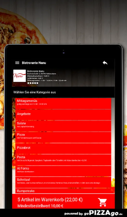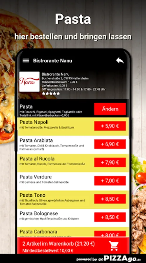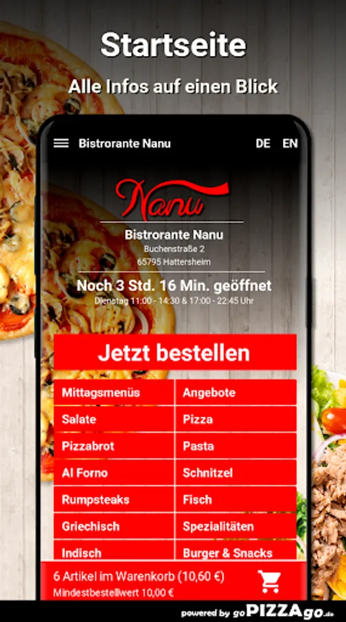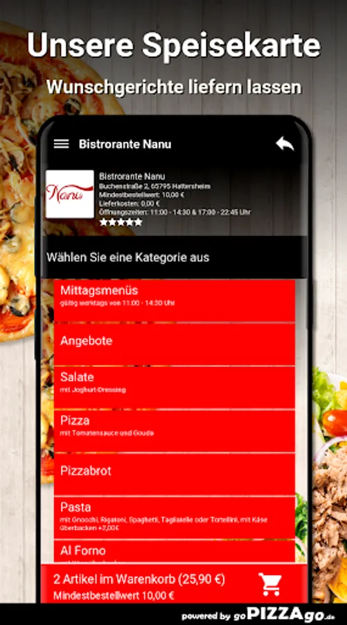Welcome to Bistrorante Nanu in HattersheimWe also have: Röstis, salads, schnitzel, pasta, burgers & snacks, pizza bread to order & have it freshly brought home?