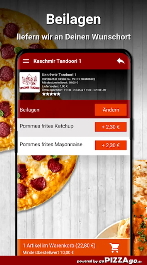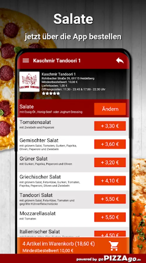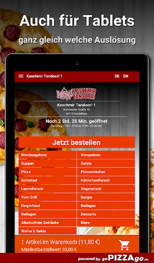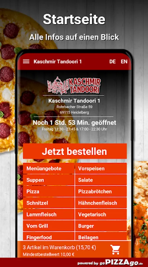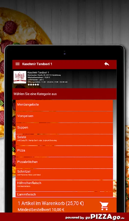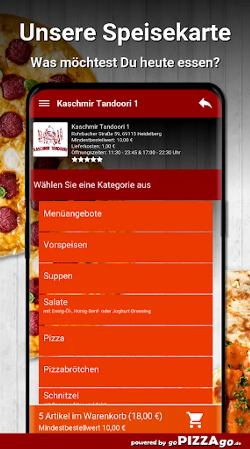 Delicious pizzas at Kaschmir Tandoori 1 in HeidelbergAbsolutely crispy pizza is also available here at Kaschmir Tandoori 1 and can be quickly delivered. Pizza LA 7.50-12.50 €, Pizza Black-Tiger is delivered to you for 8.50 to 11.50 euros, crispy Pizza Freedom, crispy Pizza Texas is available for 7.90-11.00 € for easy ordering, Original Pizza Veggie is available online for just € 7.90-11, crispy Hawaiian pizza (€ 5.00-10). Your Kashmir Tandoori 1 in Heidelberg