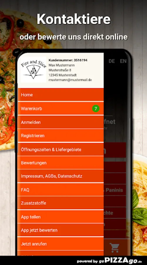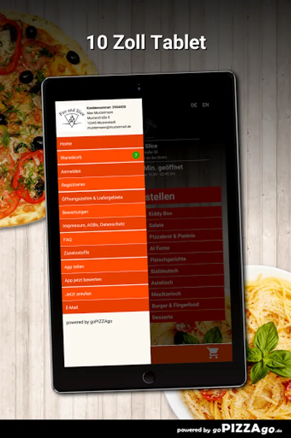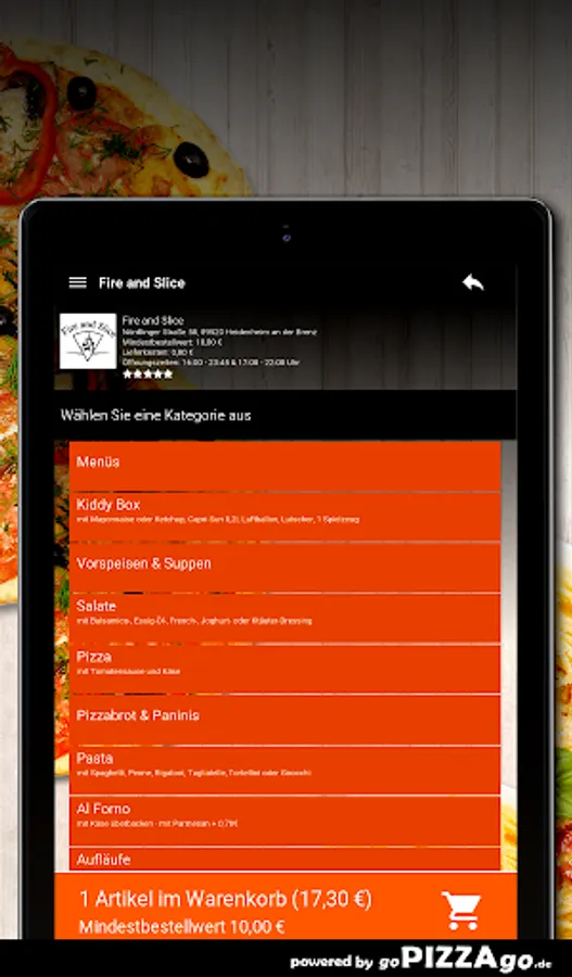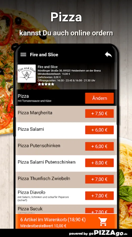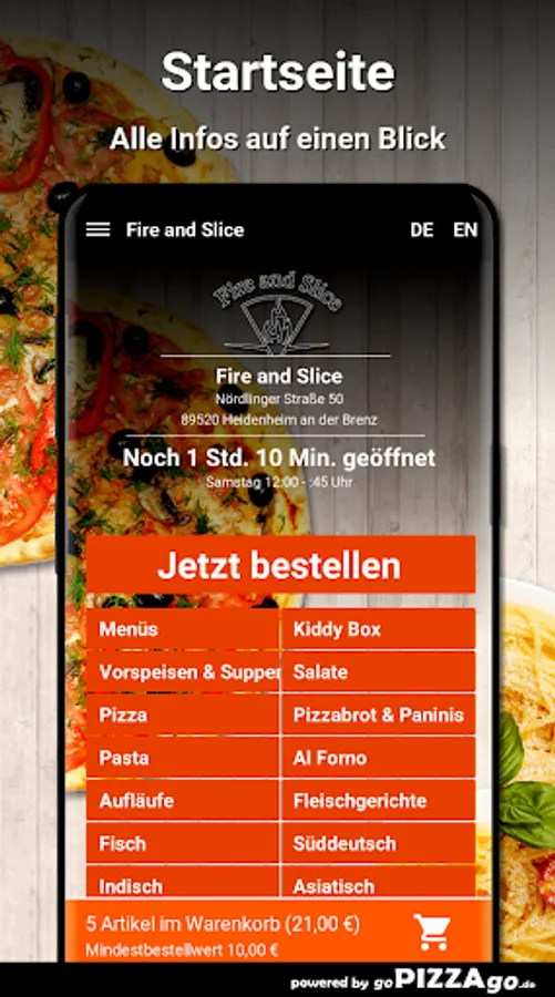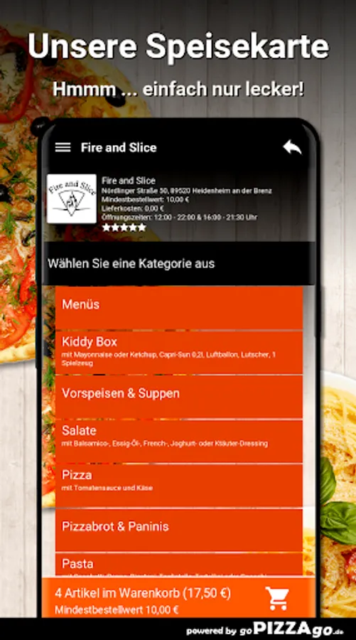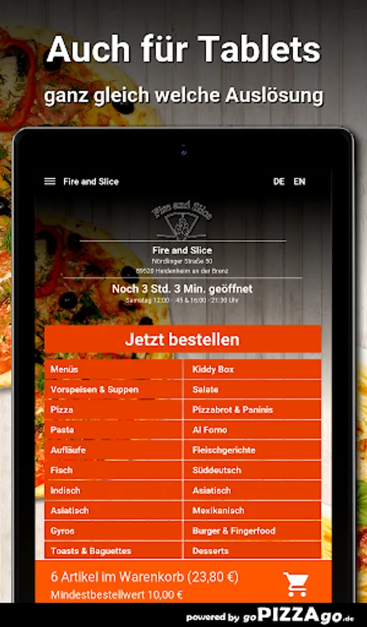 You can order many freshly prepared specialties from our Fire and Slice pizza service here. A very tasty offer of 223 dishes such as pizza sucuk, seafood salad, pizza Hawaii, pizza oriental, pasta Gorgonzola, nice salad or 2 XXL hamburgers for € 11.90. Do you fancy something sweet? Then order a dessert like 3 donuts, tiramisu, mangum almond, ½ coconut, whole lemon, baked banana. Also order soft drinks such as orange juice, mezzo mix, Coca-Cola, apple juice, multivitamin nectar, mineral water. When can I order?