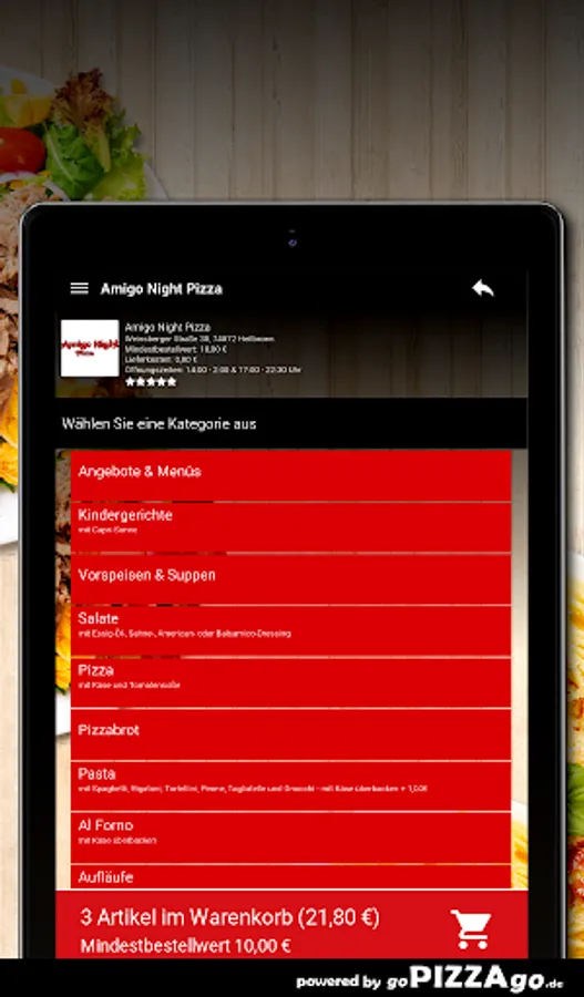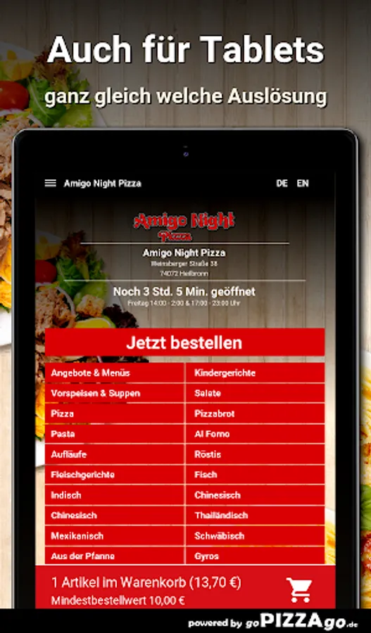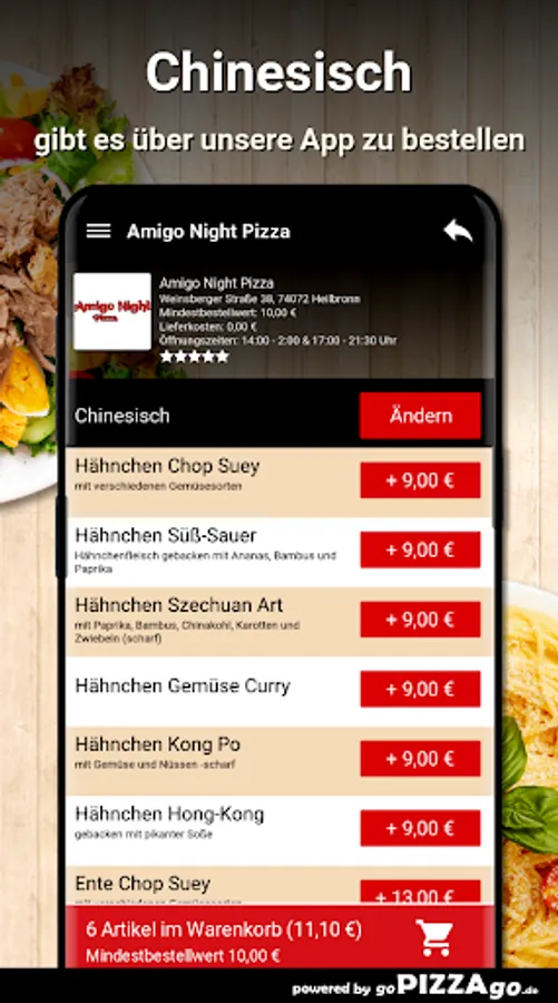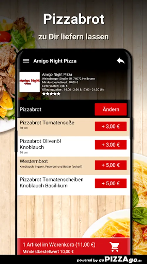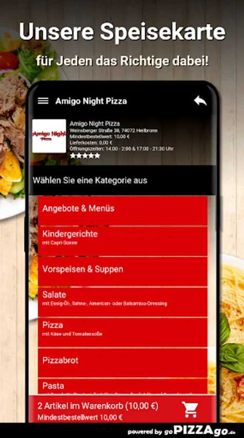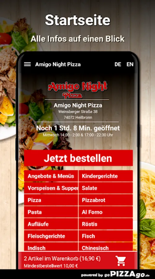 You can quickly order delicious, fragrant food from our Amigo Night Pizza delivery service in Heilbronn and perhaps have it brought to the office or home. Our online menu has more than 389 feasts, an extract: Peking soup, shoulder ham, mushrooms, artichokes, grilled scampi, vitamin bomb casserole, beef and vegetable Thai curry sauce, pasta Napoli Plus. What are our big sellers? When can I order?