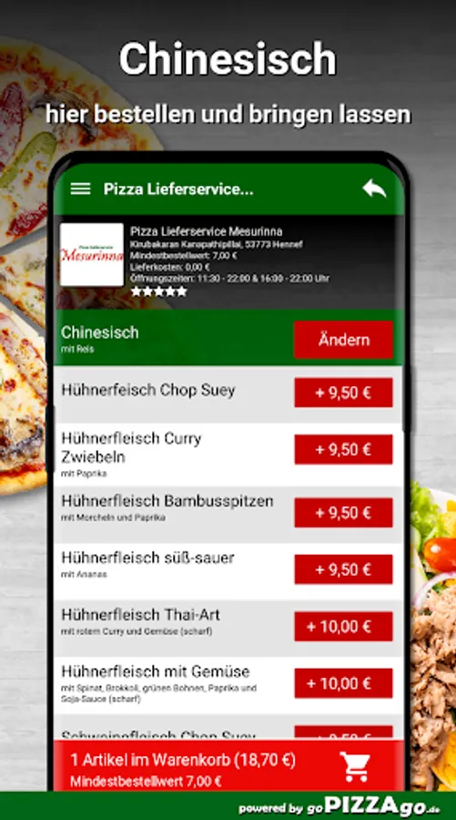 Asian delivery service is available at the Asian delivery service Pizza Delivery Service Mesurinna36 delicious Chinese dishes are available at Pizza Delivery Service Mesurinna. Beef curry sauce with rice. Pork noodles with rice are available to order for € 8.50, 6 Gyoza Vegan are available for € 5.50, mouth-watering vegetables, rice duck is available for € 8.50, duck mushrooms baked with onions can be brought wherever you want.