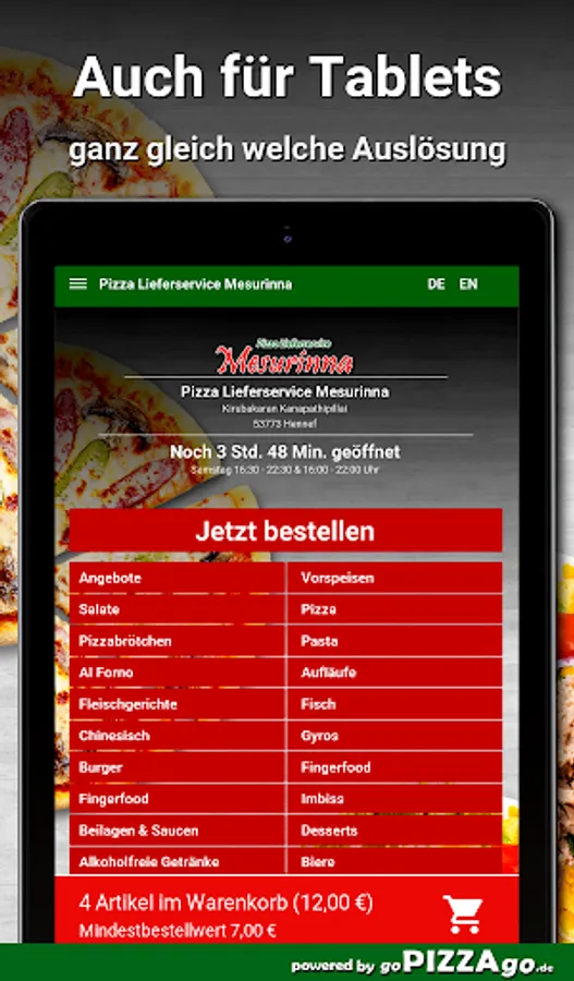 You can order many feasts quickly and securely online from our Pizza Service Mesurinna. Our menu offers over 251 freshly prepared dishes, including Insalata Cetrioli, Tortellini Primavera, Insalata Mozzarella Pomodora, Rigatoni al Forno, Pizza Gyros Calzone, Fried Potato Chips and Pizza Milano for € 7.00. The hits at Pizza Delivery Service MesurinnaWhen we do Deliver your food