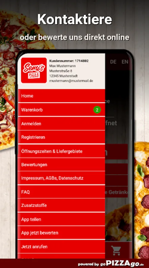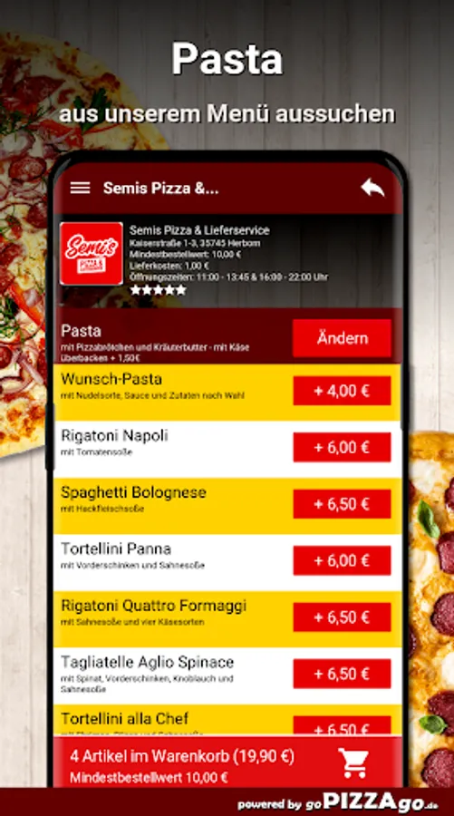 You can order many feasts online with our delivery service Semis Pizza & Delivery service easy. With us there are of course 106 feasts such as Pizza Speciale, Pizza Wunsch Classic Salami, Wunsch-Salat - Rucola Salad, Spaghetti Carbonara, Pizza Wunsch Veggie Mushrooms Paprika as well as Peperoni Schnitzel for 8.50 euros. Customers will find the following specialties best at the following times we bring delicious things