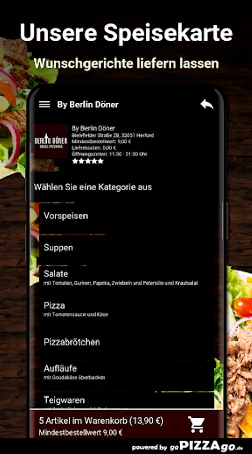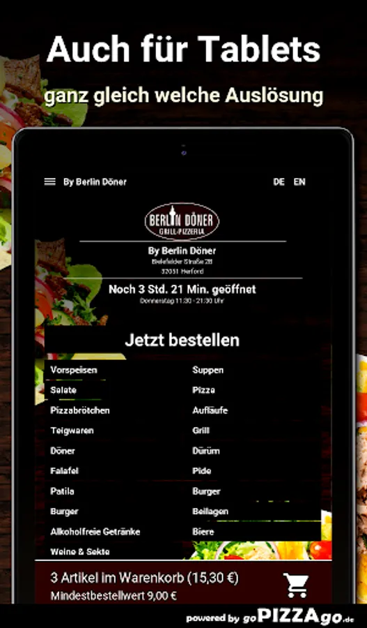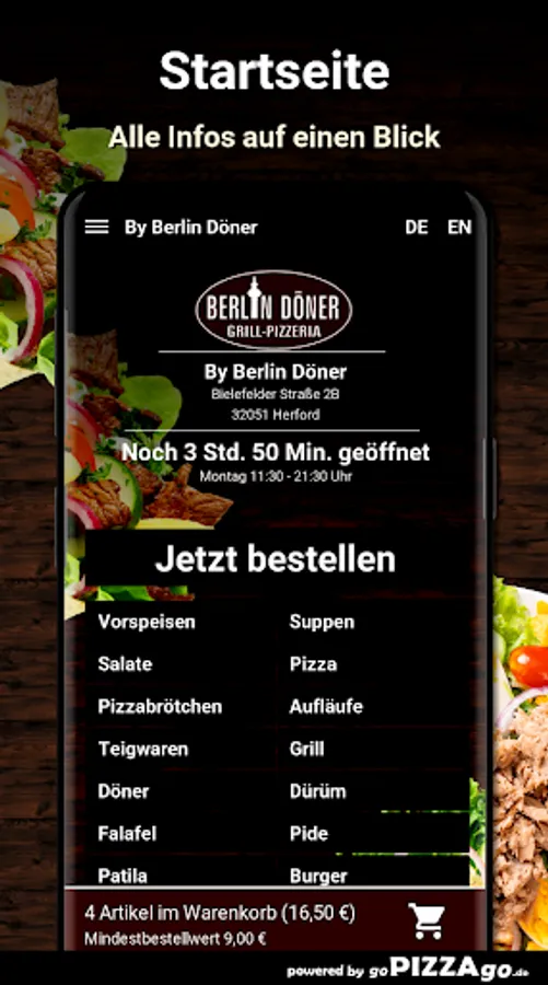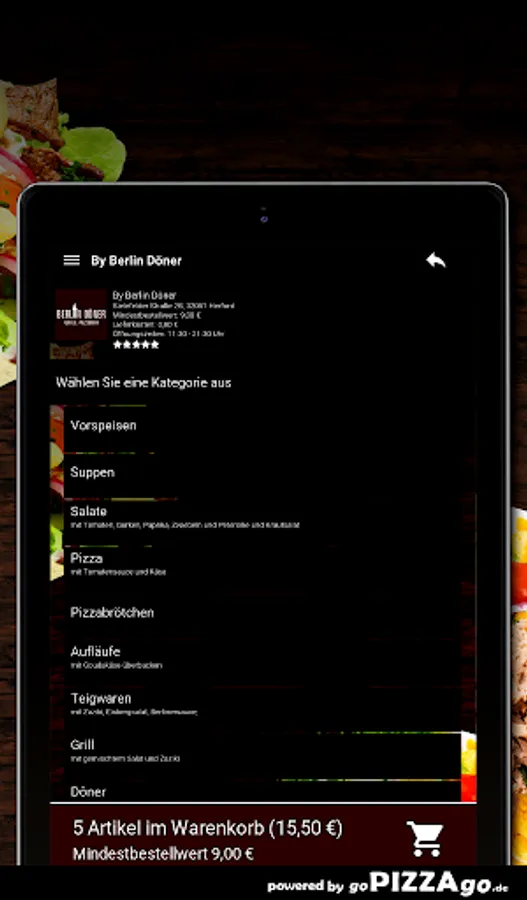 You can conveniently order and pay for deliciously prepared food online from the By Berlin Döner delivery service (Bielefelder Straße 2B in Herford). The offer on our menu includes 152 varied dishes such as Kiymali Pide, Köfte Dürüm, pizza rolls, shepherd's cheese, tomatoes, yoghurt or French fries salad mayonnaise for € 2.50. The absolute sellers at By Berlin DönerBy Berlin Döner is open at the following times