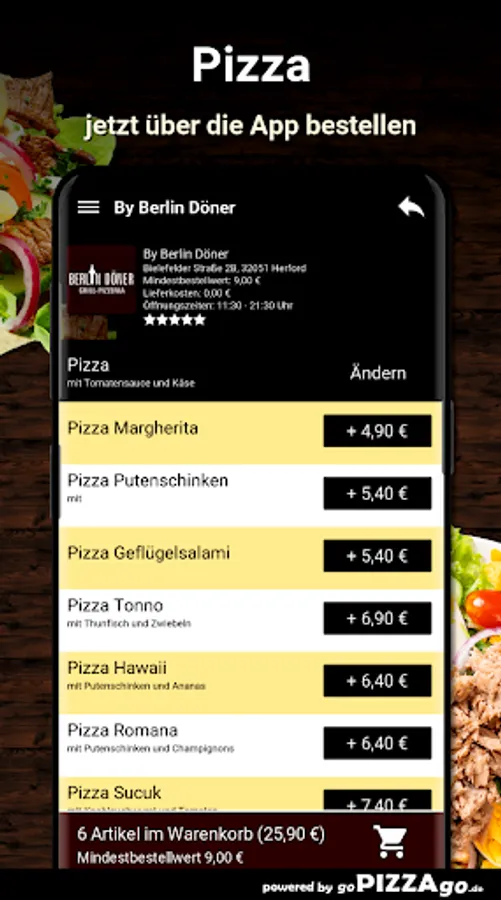You're hungry? ... at By Berlin Döner Herford there is pizza! Certainly something to your taste ... also discover our tasty pizzas! Pizza Sucuk is delivered to you for € 7.40, Pizza Döner is delivered at a price of € 7.90, Pizza Calzone Sucuk with tomato sauce and cheese can be ordered and brought to you for € 7.90, Pizza Romana is delivered to you € 6.40. Pizza Hawaii (€ 6.40), pizza calzone kebab, pizza shrimp with garlic can be ordered for € 7.40. Pizza calzone with tomato sauce and cheese for delivery or Pizza Tonno for an amazing € 6.90.