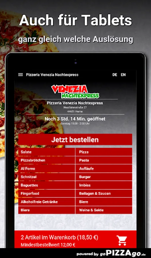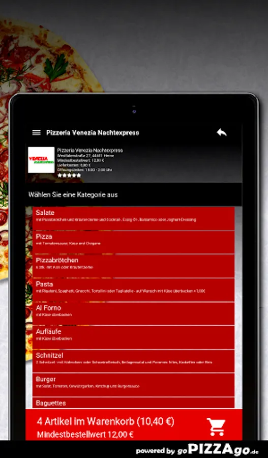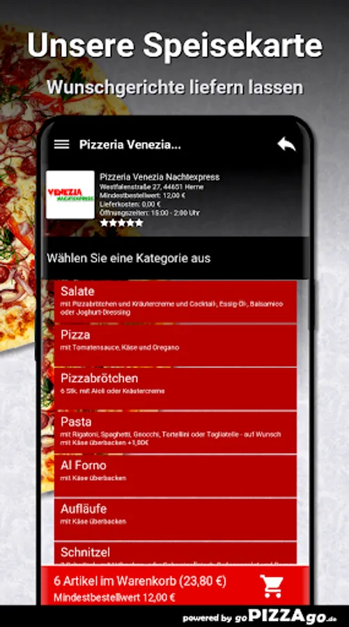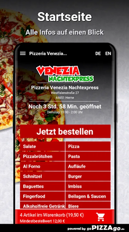 Pizzeria Venezia Nachtexpress - your delivery service in HerneHow about snacks, pasta, pizza rolls, salads, pizza, Al Forno, schnitzel ... freshly prepared to pick up or just have it delivered?