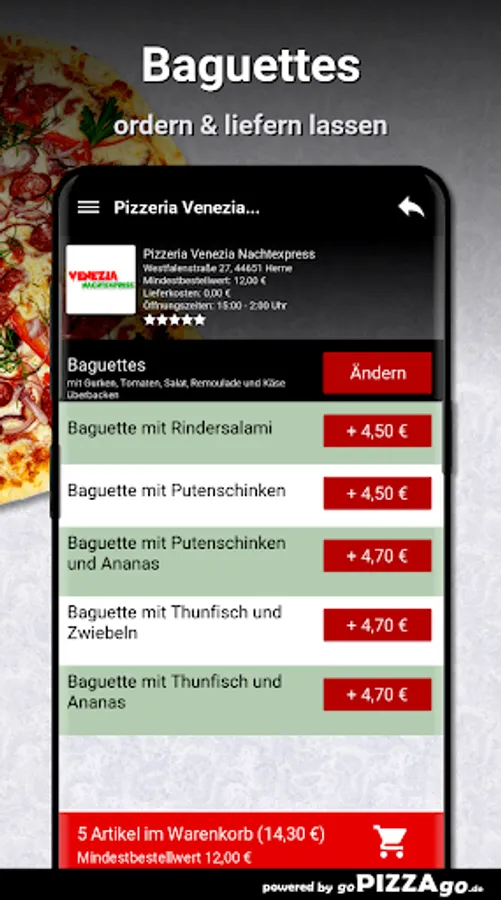 You can easily order a large selection of lovely dishes online from our pizza service. More than 185 freshly prepared dishes (hamburger, pizza hollandaise with chicken breast, baguette tuna onions, baguette gyros onions, diavolo schnitzel, cheese and cream schnitzel) .Pizzeria Venezia Night Express Top-7When we deliver your food