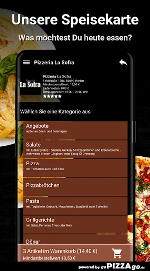 You can really order and pay for numerous aromatic specialties in our pizza delivery service online. With us you have a selection of over 145 delicious dishes. We also deliver drinks to you. We have thirst quencher 0.5l, water 0.5l, Coca-Cola 0.5l, Ayran 0.25l, Mega Monster Energy 0.5l. The most popular dishesPizzeria La Sofra is open at the following times