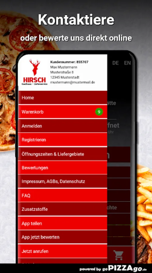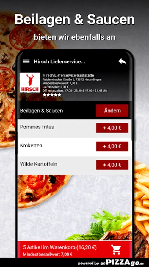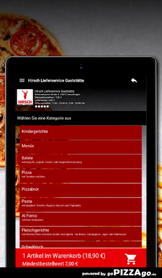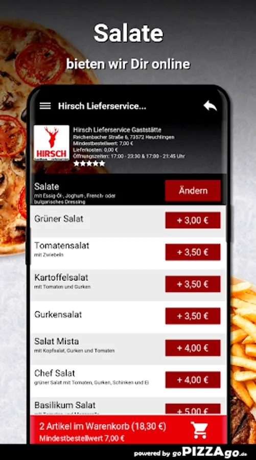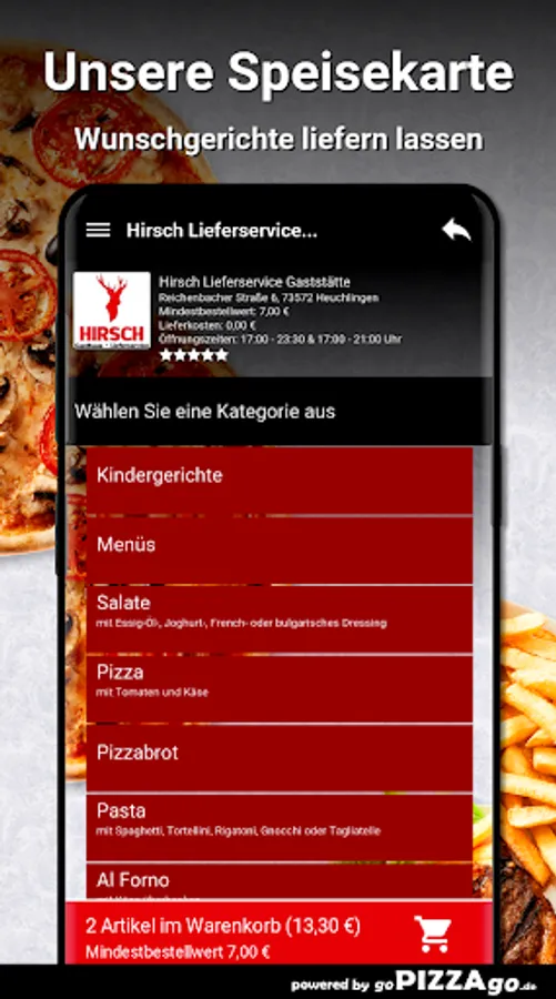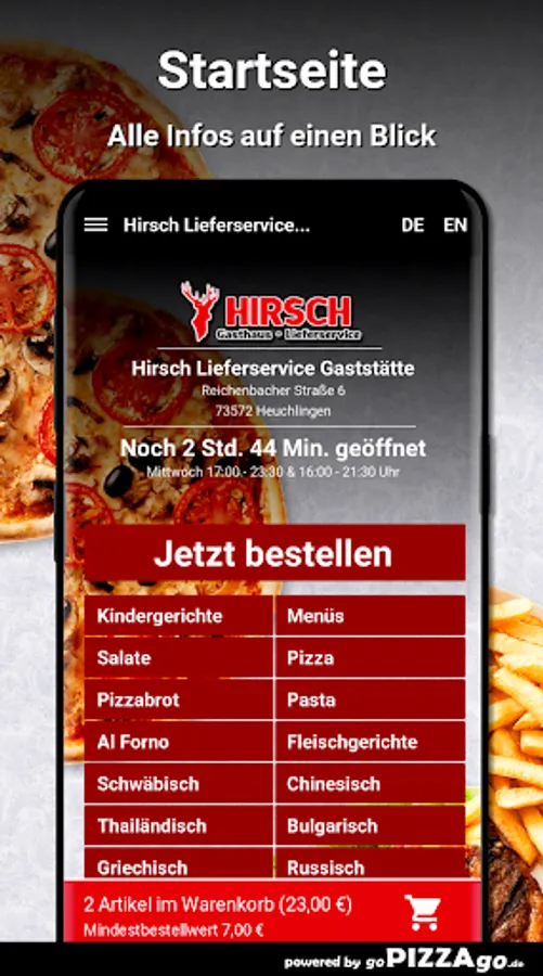 Hirsch delivery service restaurant - your delivery service in Heuchlingen At Hirsch delivery service restaurant you can order pizza, Russian, Chinese, pasta, Swabian, Al Forno, meat dishes online and have them delivered!