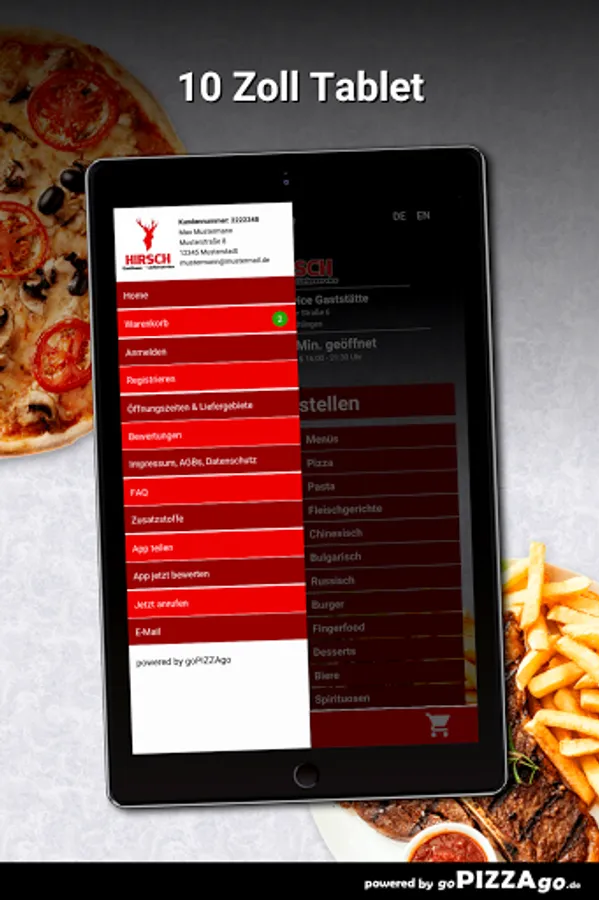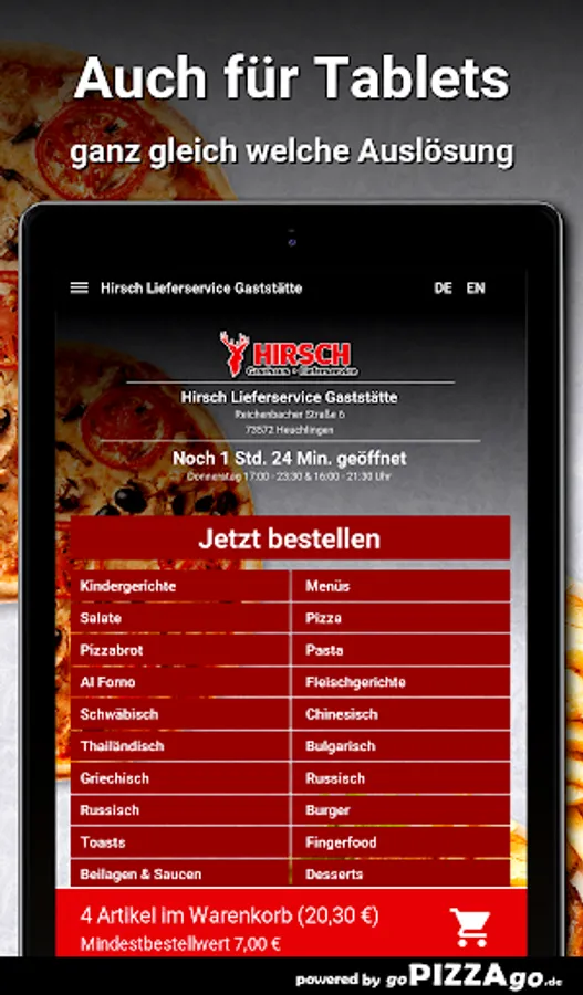 You can easily order from a large selection of delicious dishes from our delivery service Hirsch delivery service restaurant. We provide you with 209 meals (pizza calzone, Hawaii schnitzel, Russian beef, mixed salad, pasta with ham, peas, mushrooms and cream sauce, hamburger). For girls and boys we have a children's dish pizza salami for 5.00 euros, a children's dish pizza ham for € 5.00, and a children's dish hamburgers for 5.00 euros. We recommend baked banana, baked pineapple, strawberry ice cream, chocolate ice cream, tiramisu, chocolate cake as dessert.What do customers find most delicious? We deliver at these times