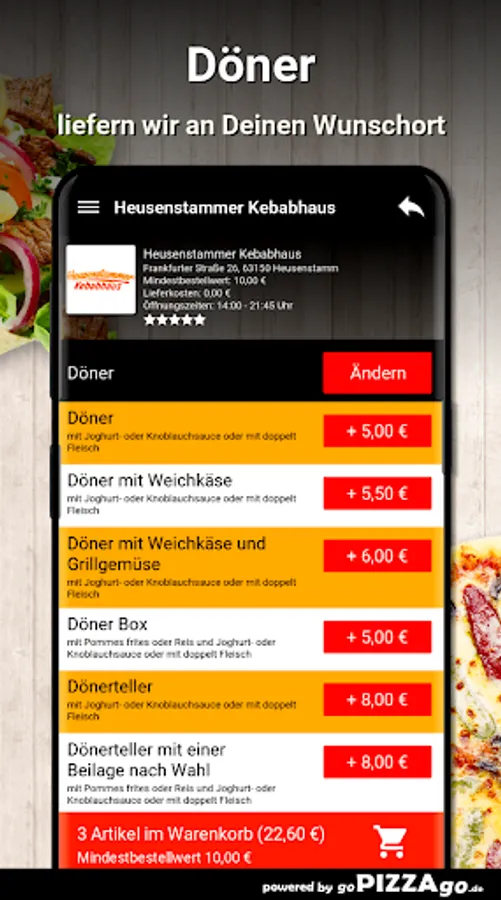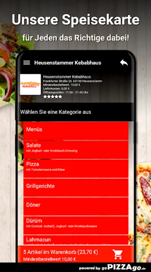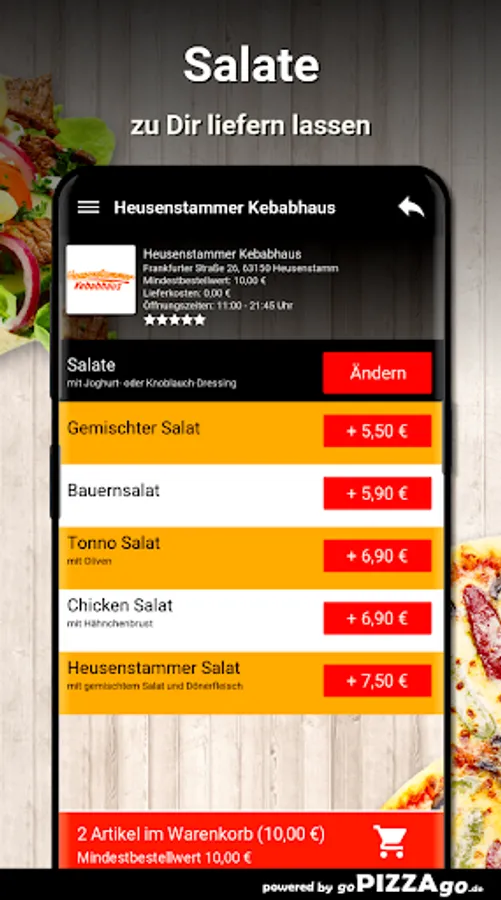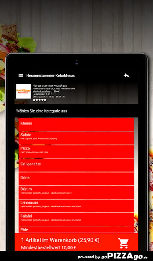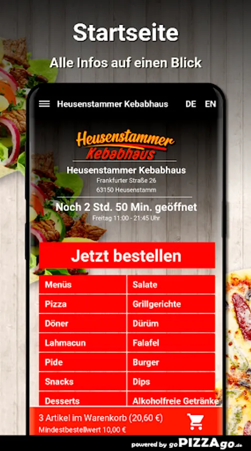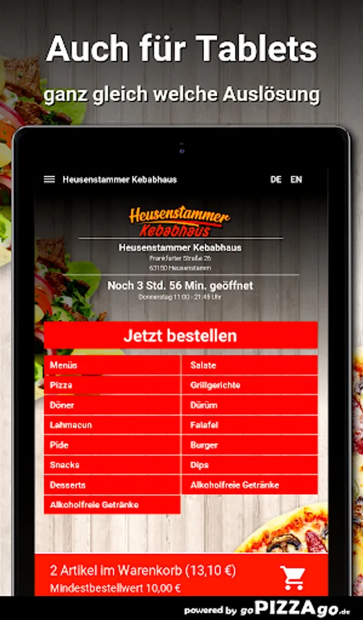 You can easily order fresh and delicious food from our Heusenstammer Kebabhaus pizza service here. In our fine menu you will find 106 dishes, including tonno salad, pizza beef salami, onions, peppers, family pizza, pide with minced meat and pizza mozzarella for € 8.00. After dinner we suggest a dessert: 2 baklava What are our big sellers? When can I order from Heusenstammer Kebabhaus?