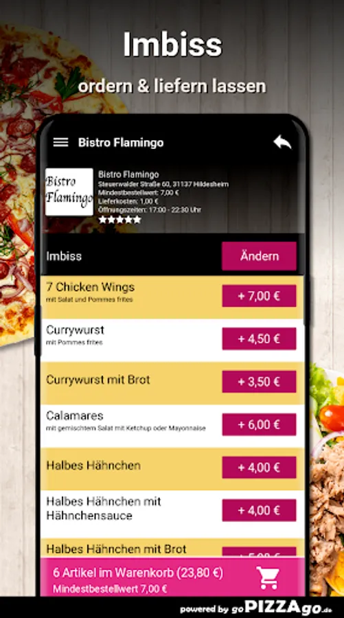 Just right fried schnitzel with the most delicious side dish at the Bistro Flamingo delivery service. Of course, we also offer you delicious breaded or natural schnitzel for delivery online. You can get crispy and hot gypsy schnitzel, Mexico schnitzel, turkey schnitzel at Bistro Flamingo for € 8.00, hollandaise schnitzel and hunter schnitzel. We are looking forward to your visit! Bistro Flamingo