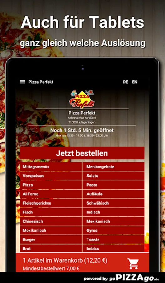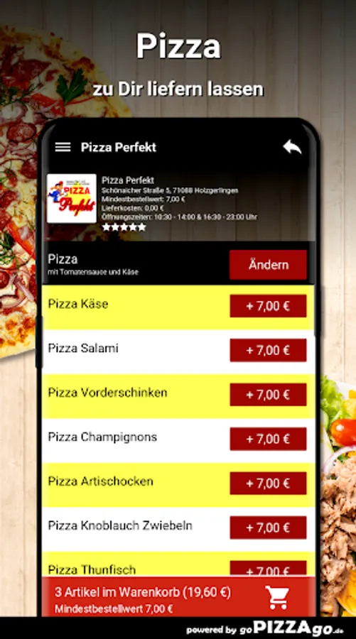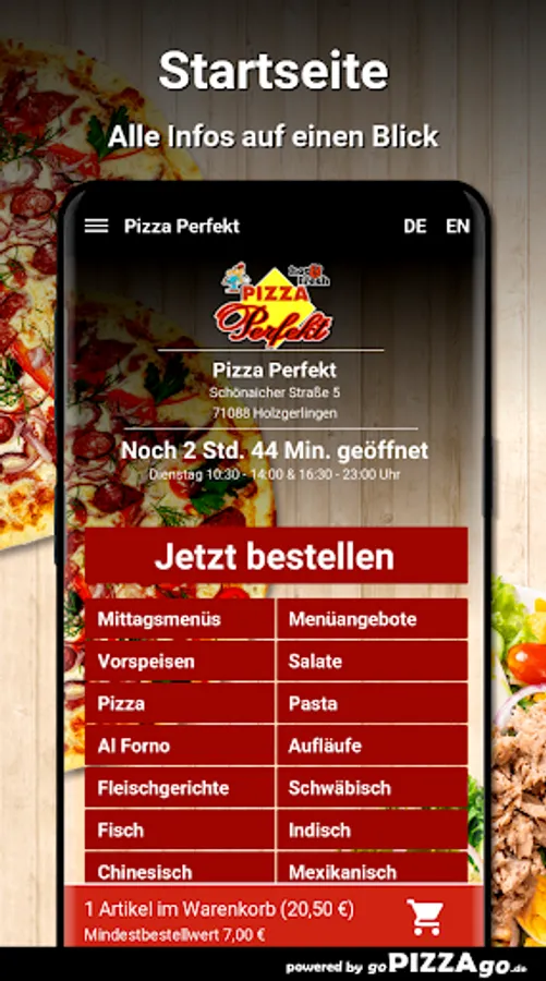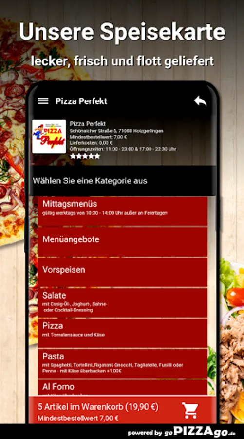 You can order delicious and freshly prepared specialties quickly and conveniently online from the Pizza Perfect delivery service (Schönaicher Straße 5 in Holzgerlingen). Choose from more than 323 goodies. We also have a large selection of drinks in our range: orange juice, apple juice, Fanta, Red Bull, Sprite, Mezzo Mix. Of course, Pizza Perfect also has lunches such as pasta (EUR 6.00), pasta baked (€ 6.00), pizza 30cm (€ 7.00), pizza 26cm (€ 6.00) at very affordable prices We are happy to order this We deliver at the following times