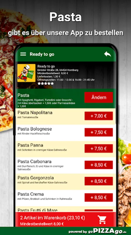 Everything totally pasta at Ready to go! Fresh, delicious, basta & buon appetito! If you're hungry for pasta, you've come to the right place in Homburg! Ready to go provides you with thirteen tempting pasta dishes. Pasta Napolitana, Pasta alla Mamma with spaghetti, rigatoni, tortellini or gnocchi + € 1.50 or Parmesan cheese + € 1.00 are brought to every doorstep by the delivery service at a price of € 8.50, you get wonderfully seasoned pasta crema Delivered to your place of residence for 8.00 euros, Pasta Frutti di Mare, such as handmade pasta Gorgonzola with spaghetti, rigatoni, tortellini or gnocchi + 1.50 € or Parmesan cheese + 1.00 € are available online here for only 8.50 € to order.
