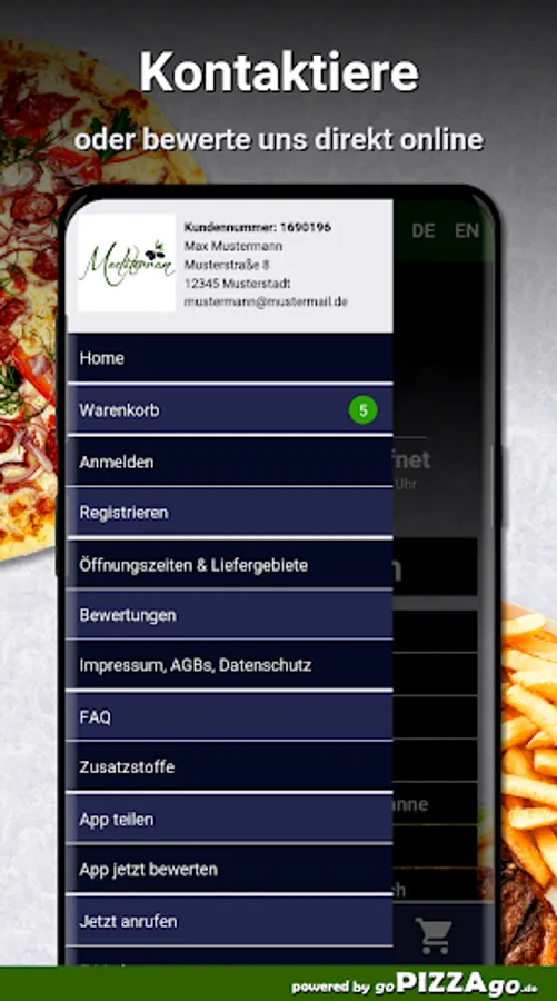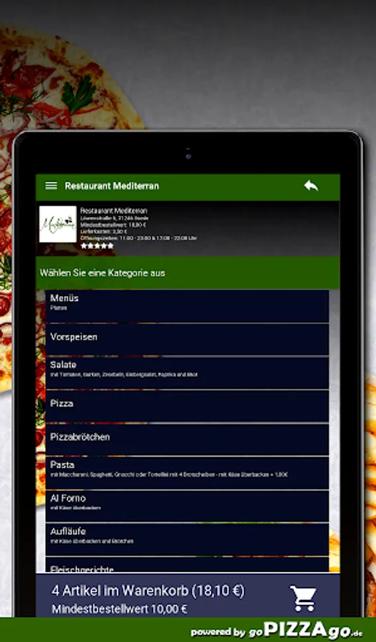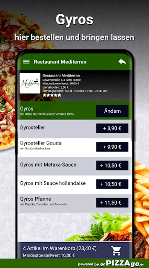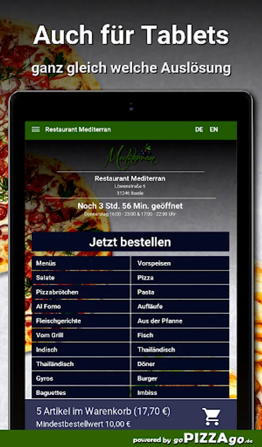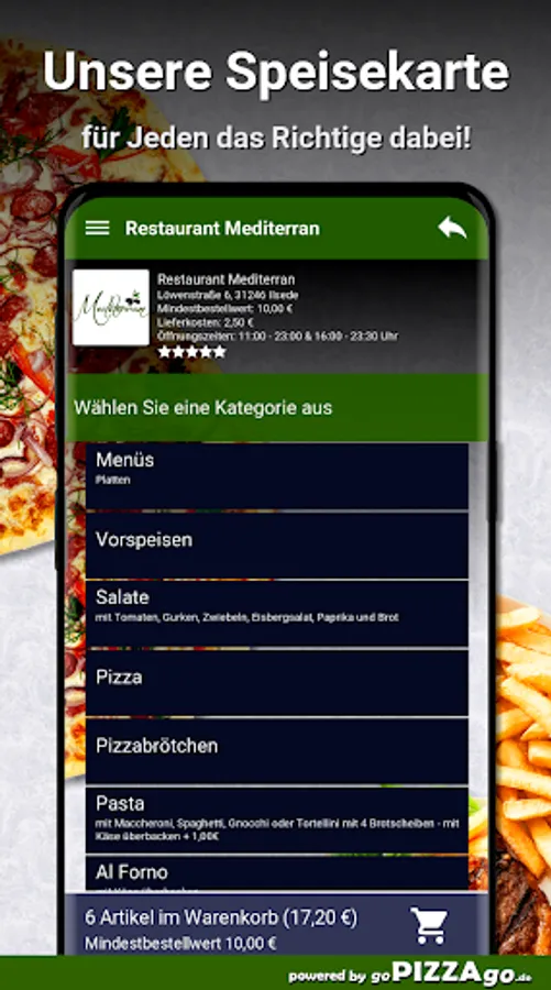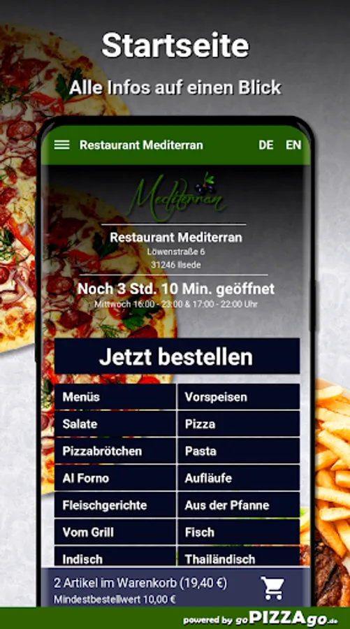 A delightful online offer of Italian freshly prepared dishes also at Restaurant Mediterran Ilsede48 absolutely delicious dishes from Italy are available for you here at Restaurant Mediterran. You can get the most exquisite pasta broccoli at Restaurant Mediterran for € 7.50, you can order Pasta Mare for € 7.00, hot veal kebab pizza is delivered at a price of € 8.00-24.00, delicious Margherita pizza is available For you from 6.00-16.50 euros, the best pizza calzone salami is available for 7.00-8.00 €, the best pizza funghi is available for from 6.50-18.50 €, delicious pasta aglio e olio is available for € 8.00 or pizza panna.