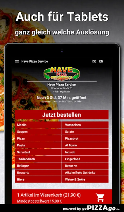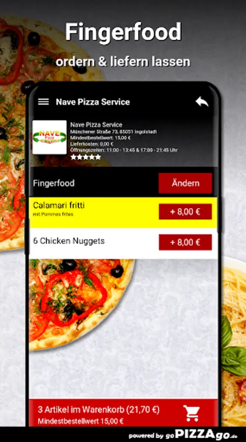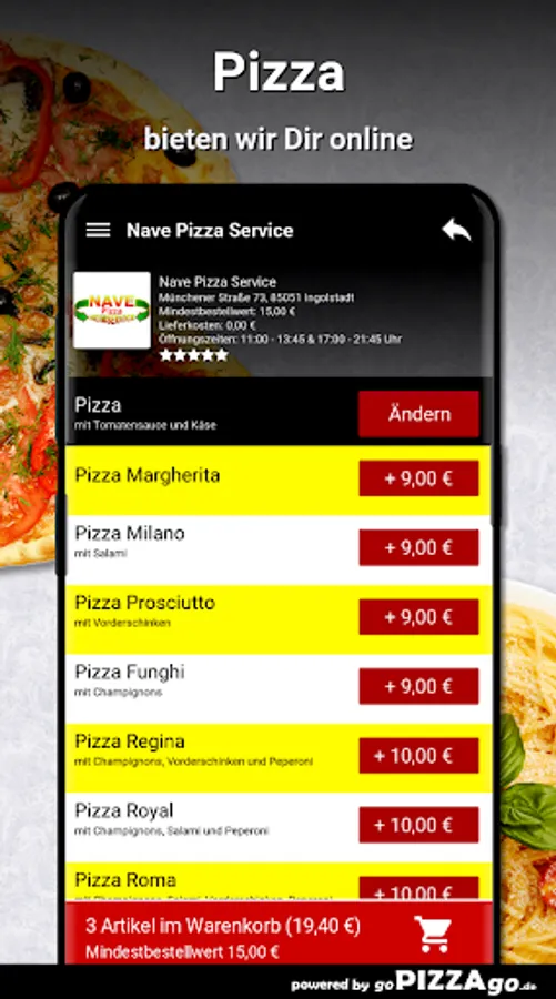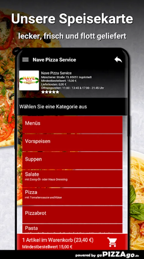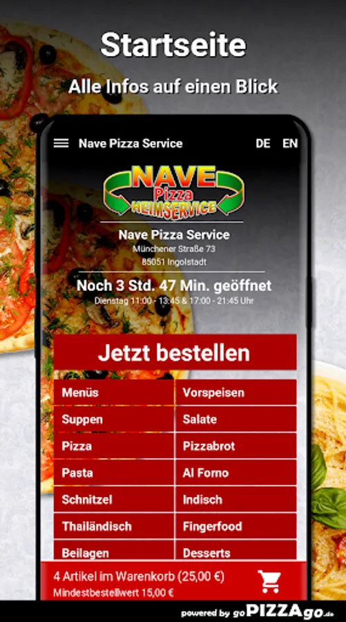 Welcome to Nave Pizza Service in Ingolstadt! At Nave Pizza Service you can order pizza, soups, schnitzel, salads, pasta, Thai, finger food online.