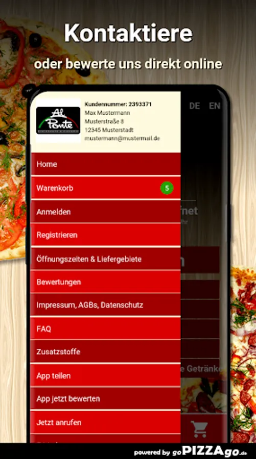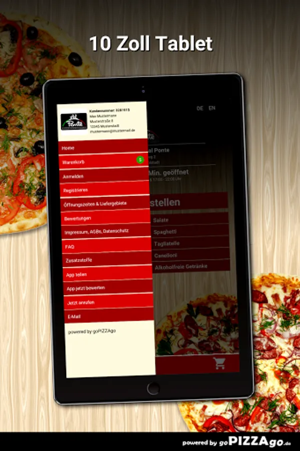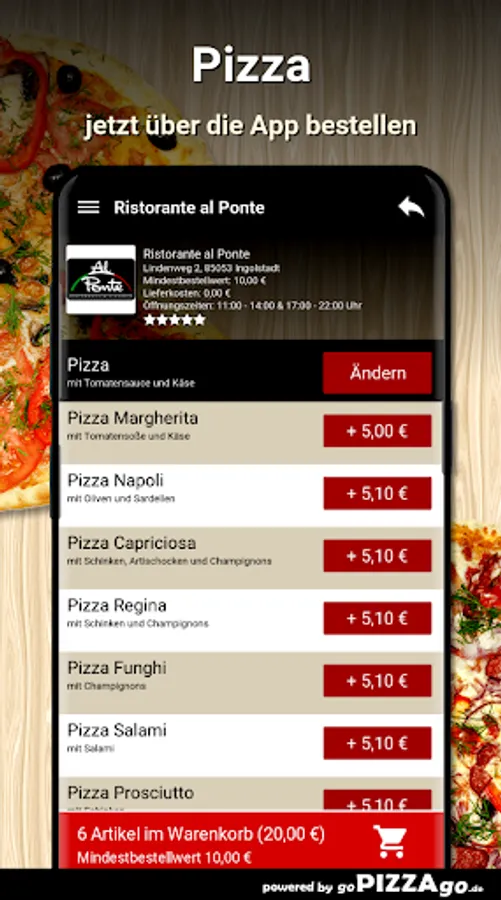 Order pizza online Ristorante al Ponte - feasting on Italy in your own four wallsOur pizzas are always a highlight. We offer you an ingenious selection with 30 pizzas. Pizza Prosciutto free delivery, Pizza Capriciosa, Pizza Messicana, Pizza Marinara with seafood, Pizza Al Ponte, the delivery service brings you conveniently to your current location at a price of € 5.80-15.20, delicious topped Pizza Roma is brought to you for € 5.10-14.00 directly to your front door.