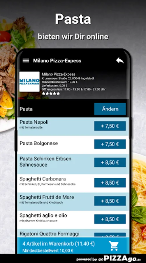 Italian pasta dishes are also available from the Milano Pizza-Expess delivery service. Milano Pizza-Expess has eighteen hot & fresh pastas in its clear menu. Pasta Napoli is delivered at a price of € 7.50.