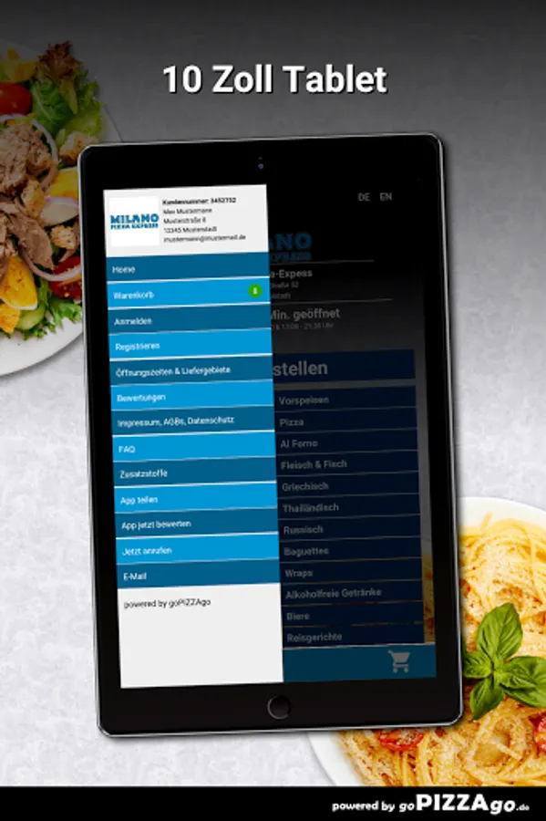 You can easily order a delicious variety of tastefully prepared dishes from our pizza delivery service and have them delivered quickly. We have 202 dishes (romaine salad, duck with vegetables, gypsy schnitzel, deep-fried calamari, pork fillet, pasta carrettiera or pizza salami ham artichokes for 22.50 euros). In addition to varied dishes, we have drinks on offer: orange juice, mezzo mix, sprite, lassi salty, apple juice