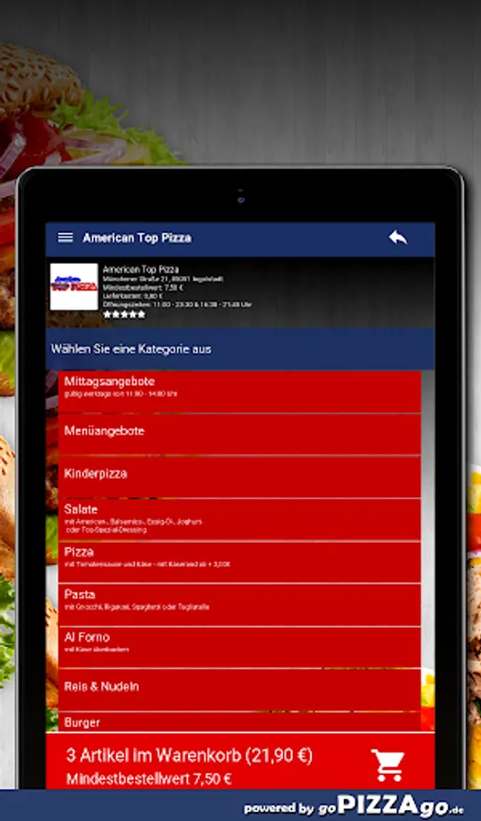 Vielfältige schmackhafte Spezialitäten kannst Du beim Lieferservice American Top Pizza (Münchener Straße 21 in Ingolstadt) einfach bestellen und sofort liefern lassen. Unser Online-Angebot umfasst mehr als 114 Leckereien wie Pizza Chicago, Pizza Malibu, Countryburger oder Chicken Salat für 6,00 Euro. Natürlich haben wir auch leckere frische Gerichte für die Kleinen wie Kinderpizza Ananas für Euro 4,50, Kinderpizza Schinken für Euro 4,50, Kinderpizza Salami für Euro 4,50, Kinderpizza Champignons für Euro 4,50. Wir haben Dir auch einen Mittagstisch mit Leckereien wie Mittagsangebot (Euro 6,90). Bitte auf die Lieferzeit achten.Unsere VerkaufsschlagerUnsere Lieferzeiten