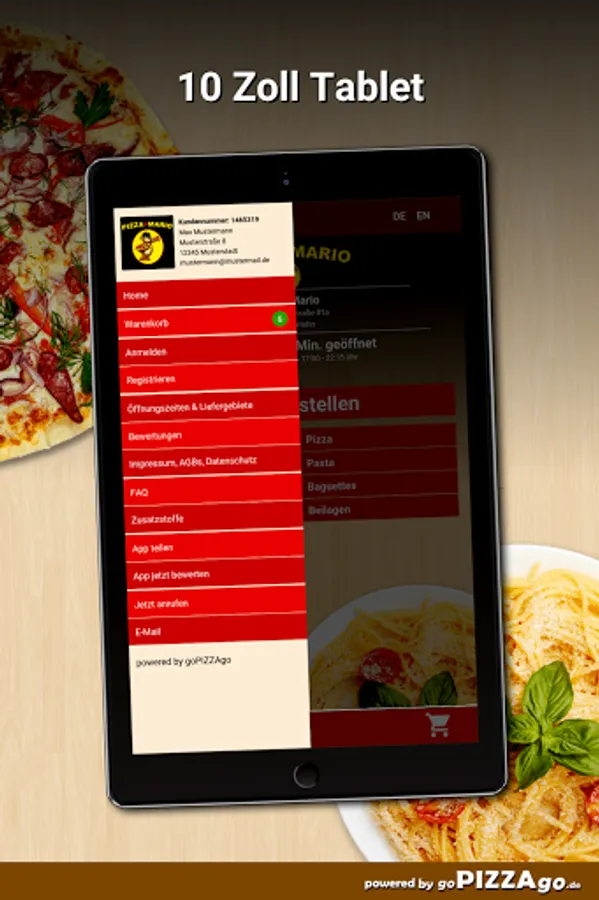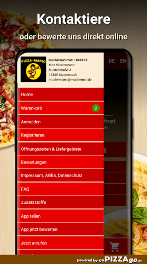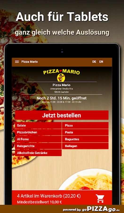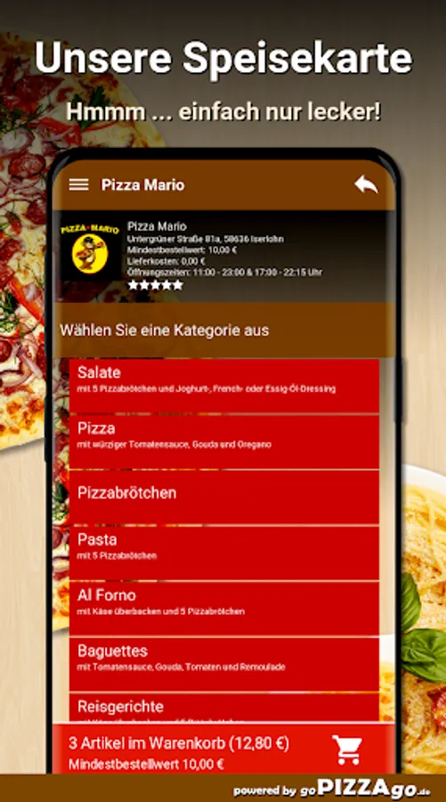 You can also order many feasts quickly and conveniently online with our Pizza Mario delivery service. Choose from more than 112 delicious dishes such as Pizza Calabria, Pizza Rommy, Pizza Calzone Vegetarian and Pizza Frutti di Mare for € 5.50. The top 7 hits here: Pizza Mario is open at the following times