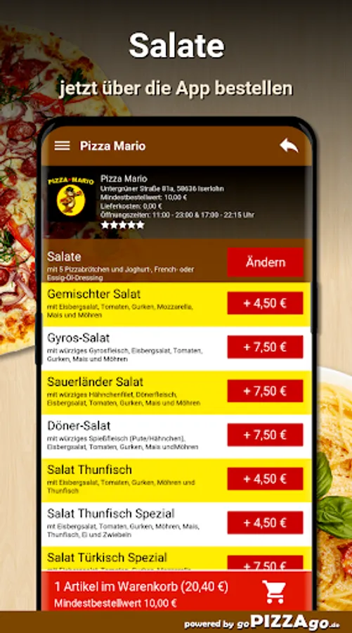 Salad tour for the health-conscious in Iserlohn? Pizza Mario makes it possible for you online! You can also conveniently order exquisite salads (14 in total) from us and have them delivered as quickly as possible. Gyros Salad (7.50 euros), Salad Chicken Special for an incredible 7.50 euros, Farmer's Salad, young and crunchy classic salads can be ordered for 4.50 euros. Doner salad (€ 7.50), Salad Chef for € 6.00, crispy Chicken BBQ salad. Sauerland salad can be delivered to your place of residence for € 7.50. Pizza Mario has salad tuna for only 4.50 euros or salad Turkish special.