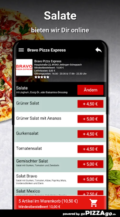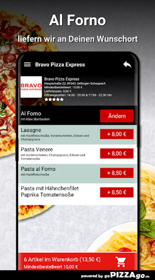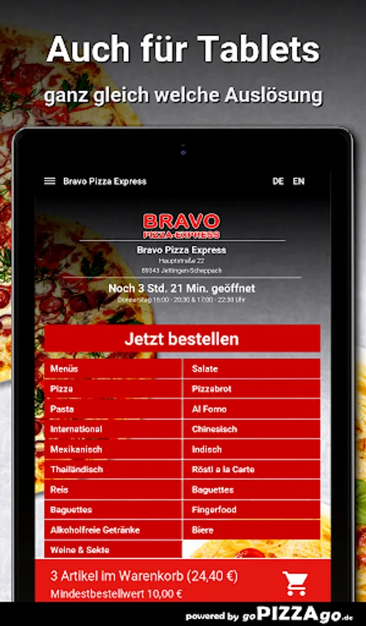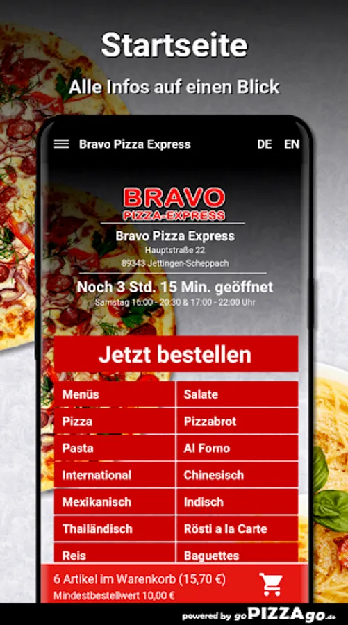 You can easily order a delicious variety of tastefully prepared dishes from the home service Bravo Pizza Express (89343 Jettingen-Scheppach) and have them delivered quickly. We have 136 dishes for you such as a large enchilada, salad kala, vegetarian pizza, salami mushroom pizza, vegetarian baguette, lasagna as well as garlic pizza bread for € 3.50. Our most popular specialties are When does Bravo Pizza Express deliver?
