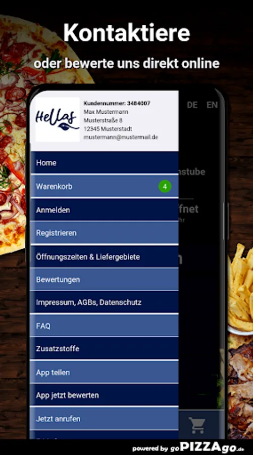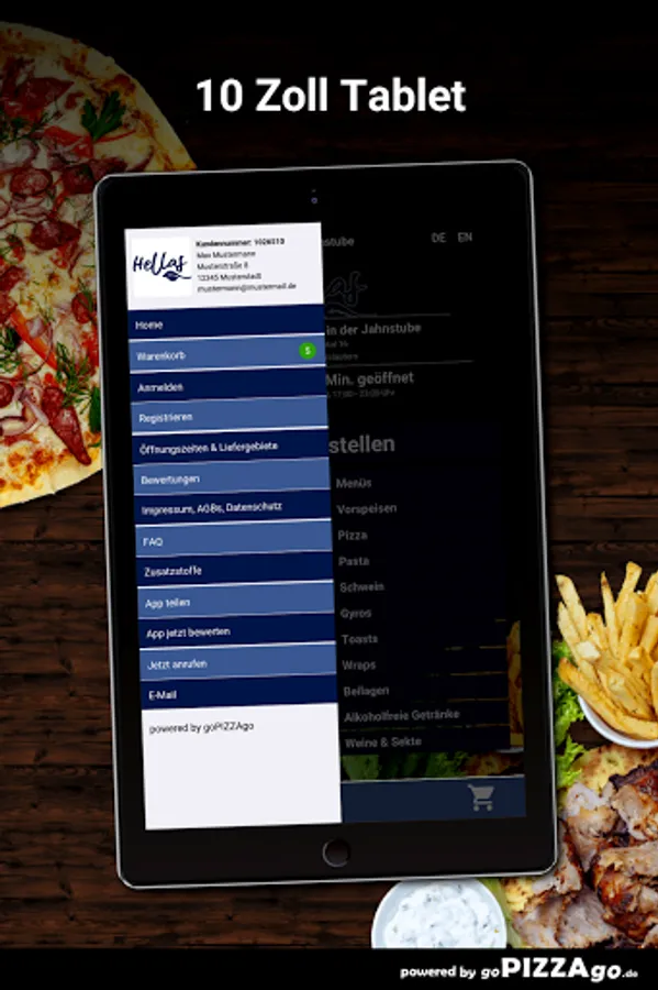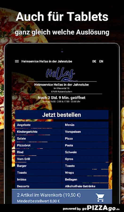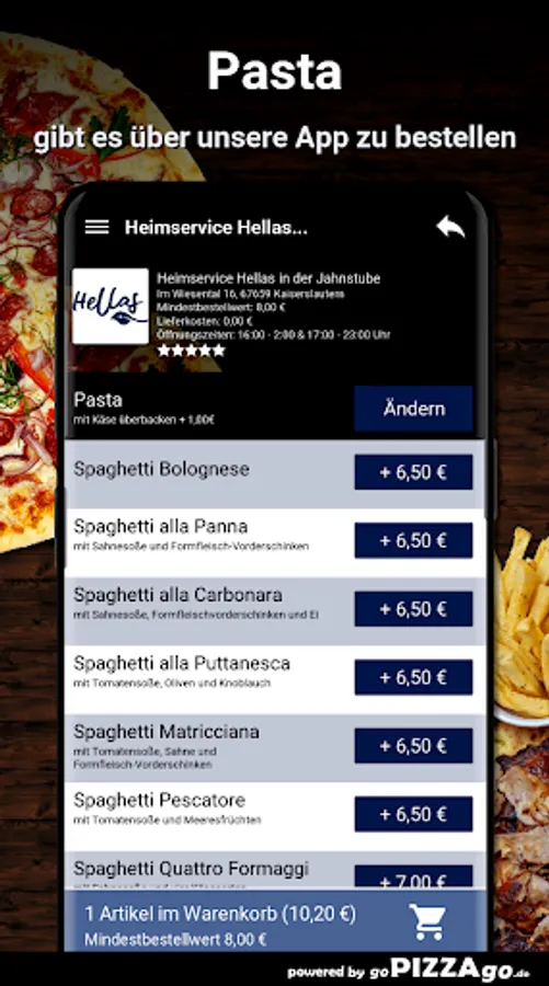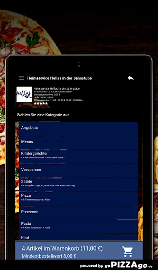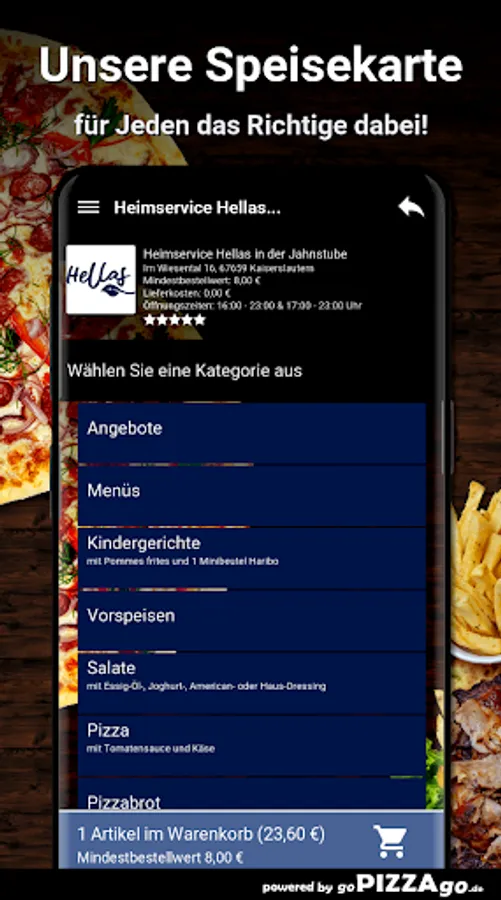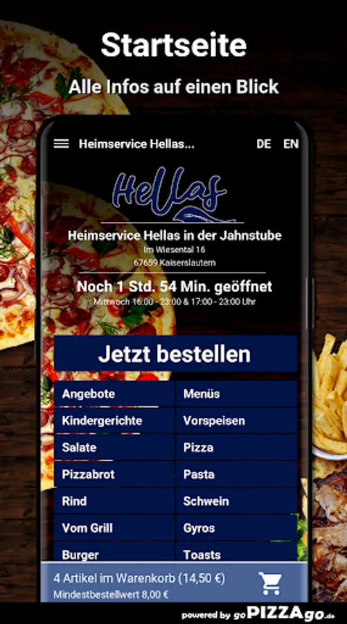 You can easily order a large selection of freshly prepared specialties from our Heimservice Heimservice Hellas in the Jahnstube in Kaiserslautern and have them delivered immediately. Choose from our menu from 245 fresh dishes, food & drinks, an extract: pizza of your choice, tortellini matricciana, garlic bread with cheese, chicken breast fillet with gypsy sauce, pasta of choice with gravy. We continue to deliver drinks such as Coca-Cola light, Coca-Cola, Sprite, Arizona Iced Tea Lemon, mineral water. For the young we have 5 chicken nuggets with Caprisonne cherry for 4.90 euros, 5 chicken nuggets with Caprisonne orange for 4.90 euros