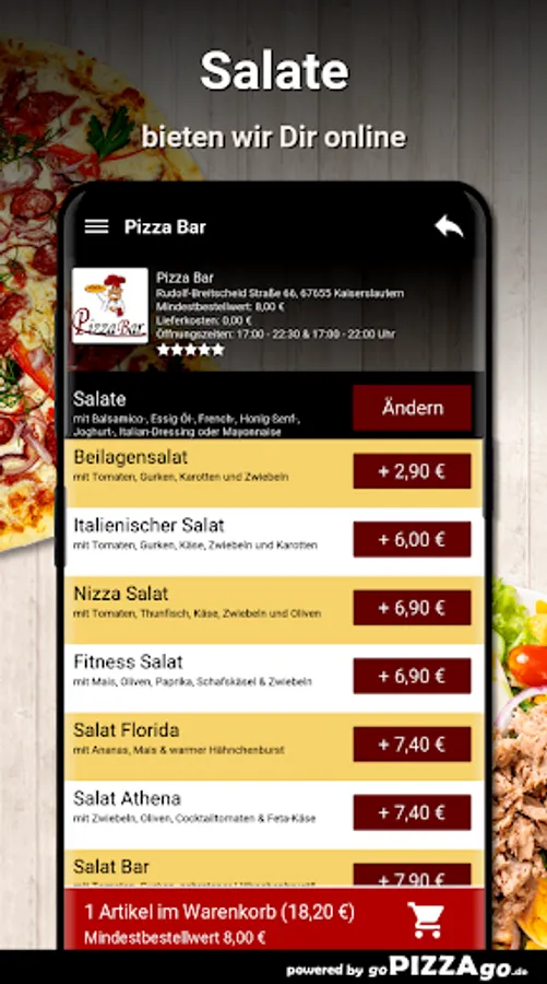 Salad home service: deliberately feast on delicious & absolutely healthy food from the pizza delivery service Pizza Bar A fine range of 6 salads are offered to you for delivery. Healthy Salad Florida has you Pizza Bar for just 7.40 €, fresh and young Nice Salad, Fitness Salad for an amazing 6.90 €, Salad Bar with balsamic, vinegar-oil, French, honey-mustard and yoghurt -, Italian dressing or mayonnaise € 7.90, Italian salad can be ordered for € 6 like, freshly prepared Athena salad is brought to you for € 6.90.