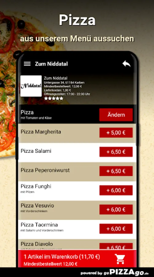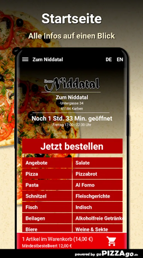 You can order delicacies and dishes from our Zum Niddatal pizza service and have them delivered to your office or home. More than 181 feasts such as gypsy schnitzel for € 11.50 or french fries for € 3.00. You can also order non-alcoholic beverages such as Ginger Ale, Sprite, Fanta, Coca-Cola. What do people like to order? When do we deliver?