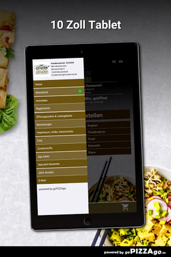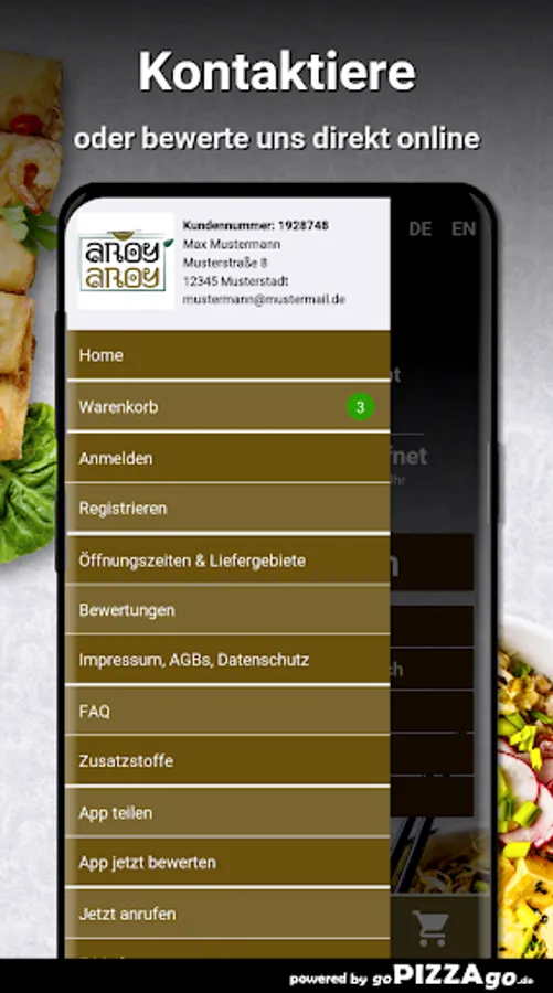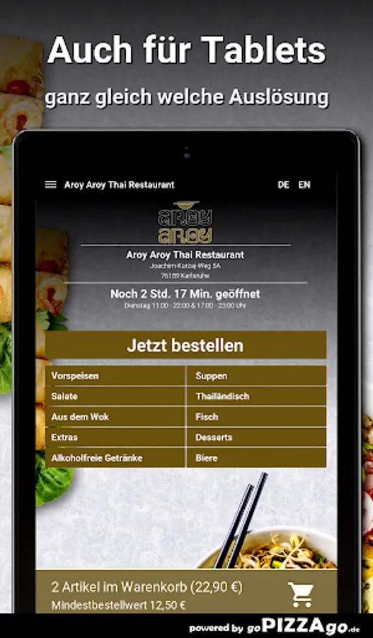 You can order and pay for delicious fragrant prepared food online from our delivery service Aroy Aroy Thai Restaurant in Karlsruhe. In the menu you will find 149 food: Phat Bak Bung, Bieuw Wan with duck, Phat Bami, Nam Man Hoi with beef, Phat Pik Tai with chicken for € 10.90. For dessert we recommend Khau Niew Mamuang, Roti with sweet milk sauce, Ben & Jerry's Cookie Dough, Ben & Jerry's Chocolate Fudge Brownie. We order this most of the time.When can I order?