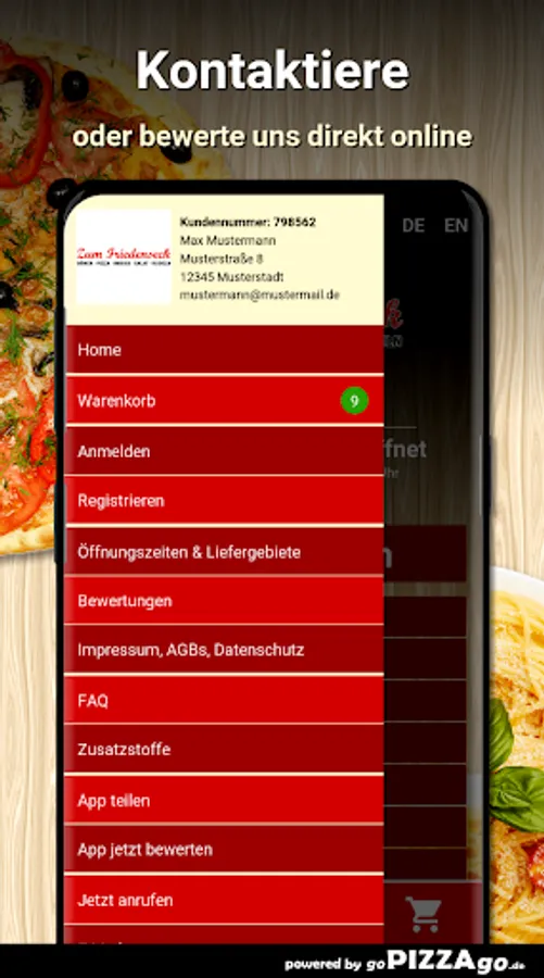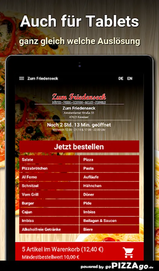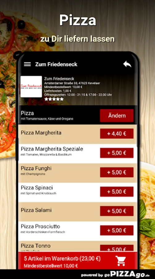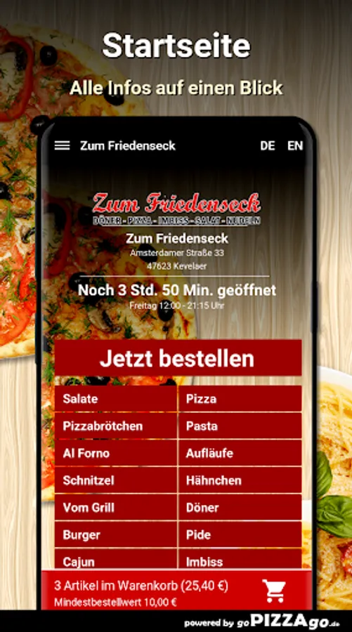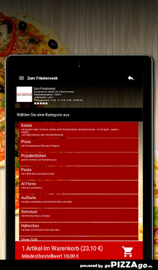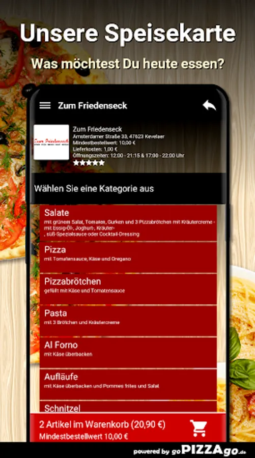 You can order and pay for fresh and delicious food online from our Zum Friedenseck pizza delivery service. With us you have a selection of over 177 feasts. Customers are very happy to order this. The Friedenseck is open at the following times