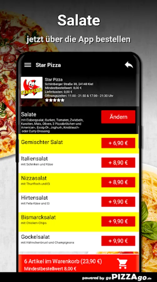 Discover wholesome Italian fresh dishes such as pasta and pizza with the Star Pizza delivery service. 36 very delicious Italian dishes are available here from Star Pizza. Aromatic tasty Pizza Mond, noodle pan al Forno has Star Pizza for only 9.50 €, Pizza Calzone America 9.90 €, Pizza Ottawa (5.70-11.90 €), Star Pizza has excellent lasagna for only 9.50 euros to pick up or deliver like, the best pizza Eris.
