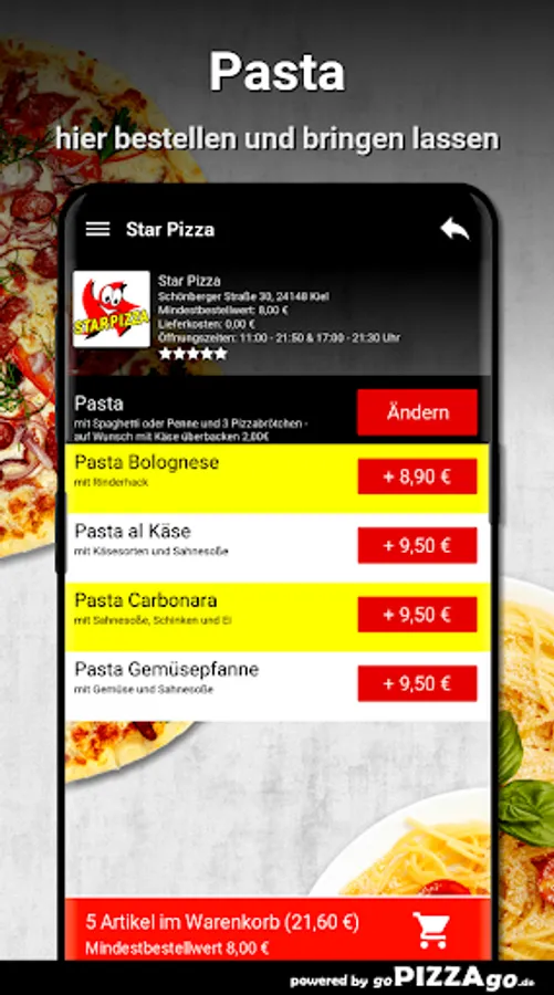 Delicious Italian pastas are also available from the Star Pizza delivery service.The Star Pizza pasta offers are a culinary adventure for the palate. With four pasta dishes, we offer a fresh selection here. Pasta al cheese is delivered at a price of € 9.50, pasta vegetable pan is delivered to you free of charge for € 9.50, pasta Bolognese is delivered to you for € 8.90 & pasta carbonara.