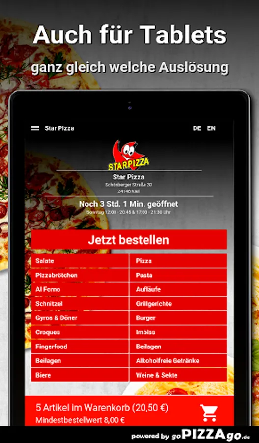 You can order and pay for many freshly prepared dishes in our online shop at the Star Pizza delivery service (Schönberger Straße 30 in Kiel). Our menu includes 107 dishes, 10 chicken chips, Hawaiian pizza, croque ham, and Uranus pizza. We continue to deliver drinks such as Fanta, Mezzo Mix, Sprite, Coca-Cola light. The hits at Star Pizza Our delivery times are