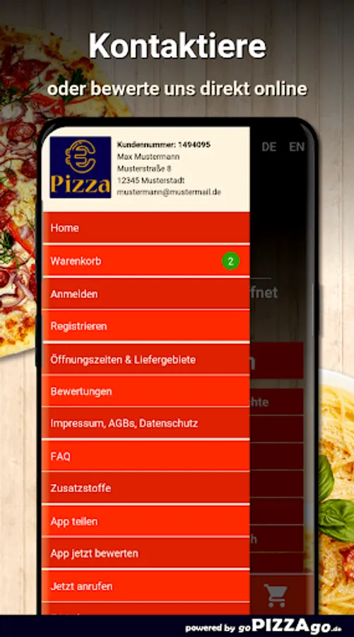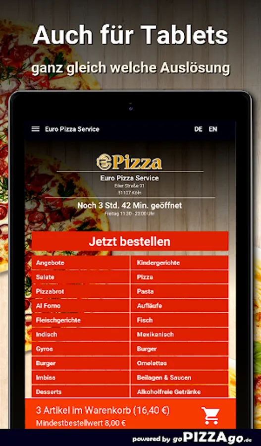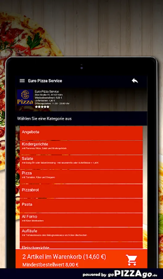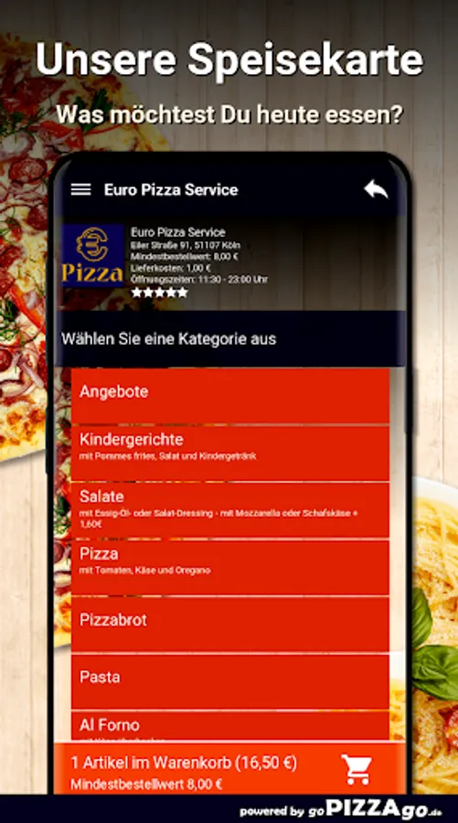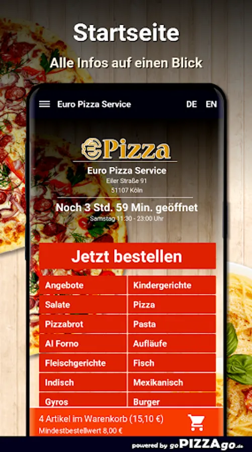 You can order and pay for numerous dishes online at our home service Euro Pizza Service in Cologne. You can choose from over 414 dishes and drinks such as Tortellini alla Panna for € 7.70 or Pizza Regina for € 21.00. Also order drinks: Iced tea, Capri-Sonne multivitamin, orange juice, Coca-Cola, Coca-Cola light. Customers find the following specialties best The delivery times of Euro Pizza Service