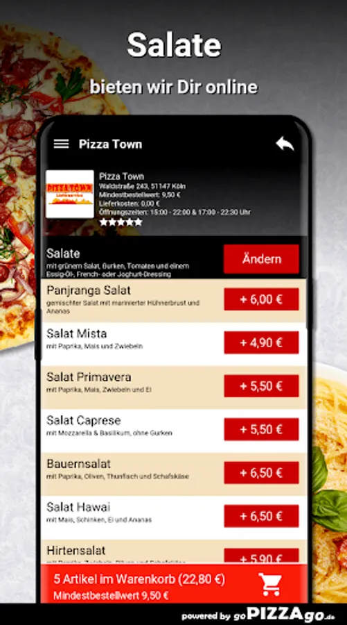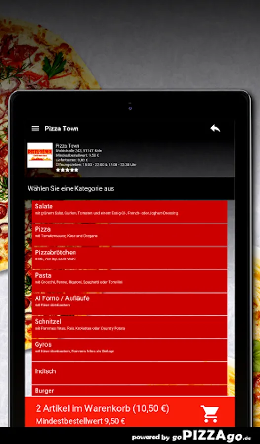You can order and pay for many delicious dishes online from the Pizza Town delivery service (51147 Cologne). The menu in the online shop offers you more than 205 dishes such as Krahi, Panjranga Salad, Pizza Hot Peperoni, Pasta Bombay or Pizza al Mare for € 6.00. The hits at Pizza TownWhen is Pizza Town delivered?