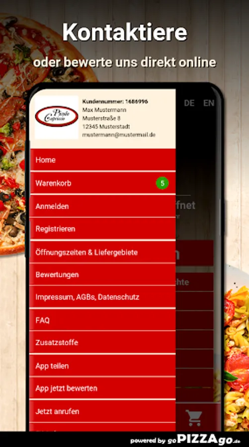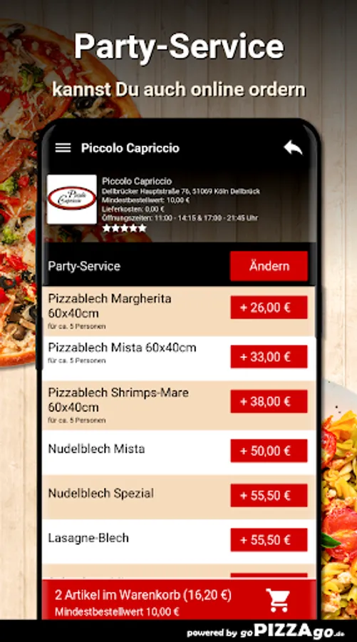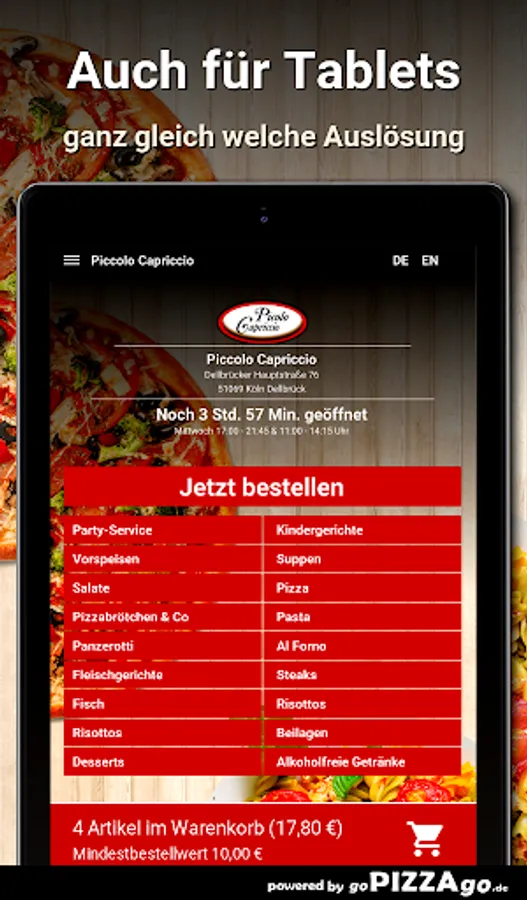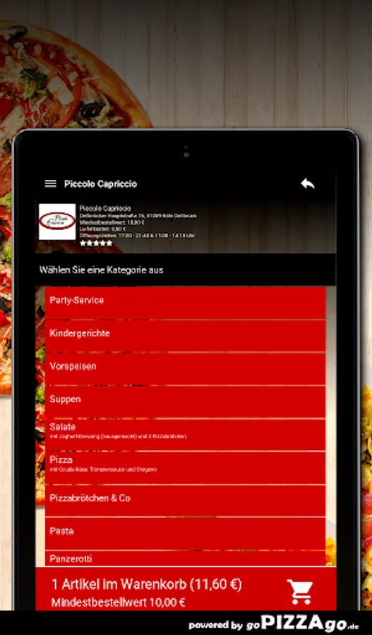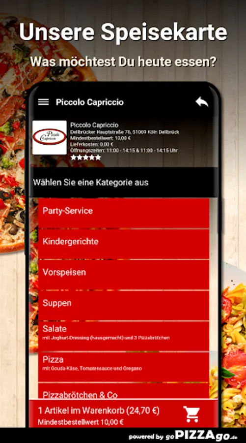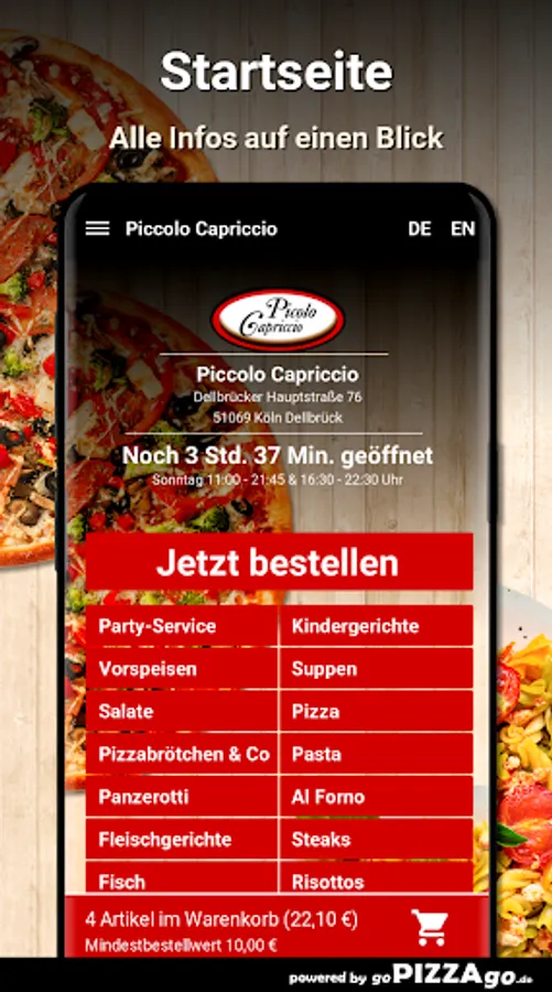 You can order quickly and securely online from a large selection of dishes in our pizza delivery service. You will find 265 delicacies in our menu. Our top sellers When can I order from Piccolo Capriccio?