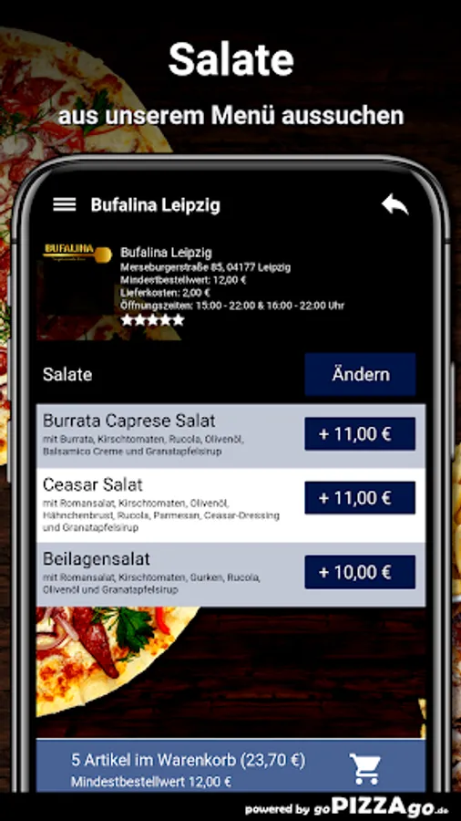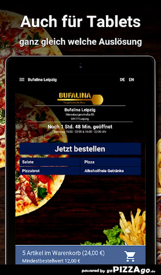 You can order salads and pizza from Bufalina Leipzig here and have them delivered. Of course, you can order and pay for delicious food from our pizza service online. Choose from a great range of 59 food & drinks, including Pizza Potato e Prociutto, Pizza Melenzanella, Pizza Gorgonzilla, Pizza vegetarian, Pizza Pomodorini, Pizza The Best, Pizza Quattro Stagioni, Pizza Funghi or perhaps Pizza Sucuk Spezial for €12.00 . You can also order soft drinks, we have Fritz Limo Honeydew Melon, Ice Tea, Mezzo Mix, Fritz Limo Lemon, Coca-Cola. What do people like to order? When can I order from Bufalina Leipzig?