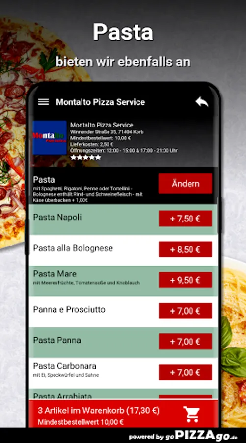 A piece of Italy around the corner from Montalto Pizza Service in Korb A tasty online selection of eight pasta dishes is also offered here. Montalto Pizza Service has Pasta alla Bolognese for just € 8.50 to order, Pasta Mare to order, Pasta Carbonara for an amazing € 8.50, and Pasta 4 Cheese at Montalto Pizza Service for € 9.00.