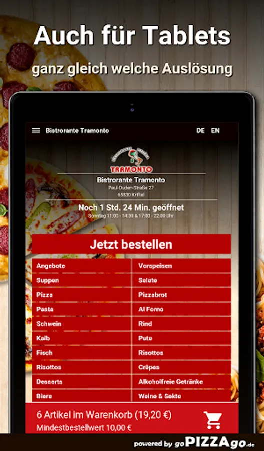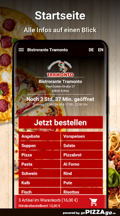 Welcome to our Pizza Service Bistrorante Tramonto, with us you can order Al Forno, soups, pizza bread, veal, beef, crepes, turkey, fish online.