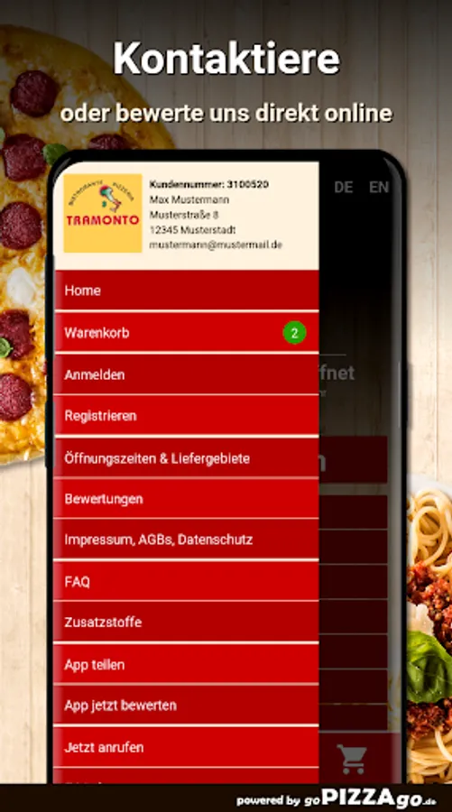 You can order an incredible number of freshly prepared dishes online from our Bistrorante Tramonto easy delivery service. The menu has a selection of 158 dishes and drinks such as Pizza Spaghetti, Rigatoni Bolognese, Pizza Prosciutto, Calamari alla Griglia, Insalata di Rucola e Parmigiano. The hits at Bistrorante Tramonto When does Bistrorante Tramonto deliver?