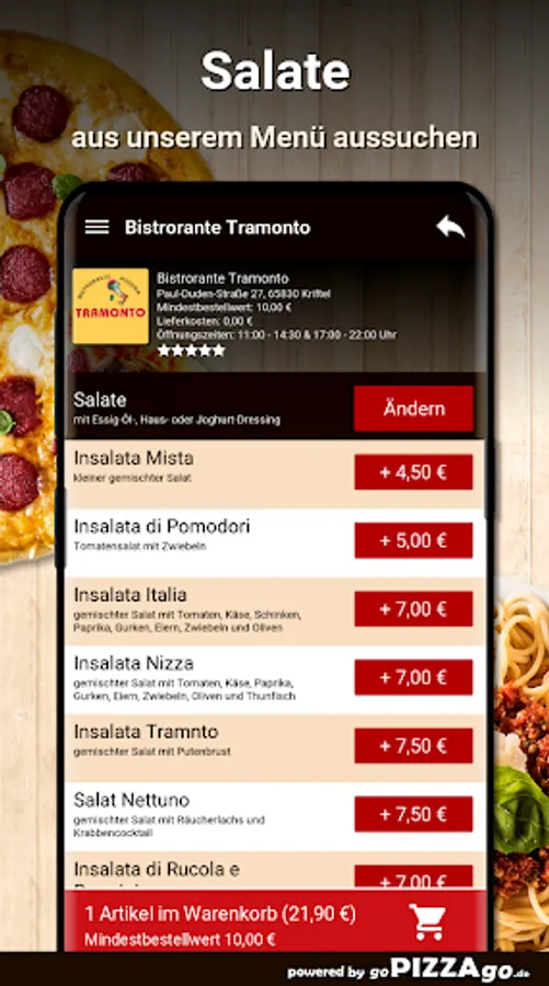 Order fresh salad creations at Bistrorante TramontoOur 9 salad dishes that you can order online at Bistrorante Tramonto are also really healthy. Salad Nettuno will be brought to your current location for € 7.50, you can get Insalata Italia at Bistrorante Tramonto for € 7.00. Bistrorante Tramonto has Insalata di Rucola con Funghi misti for only 8.50 €, Insalata Mista small mixed salad or crispy fresh Insalata di Rucola e Parmigiano can be delivered to your home for 7.00 €.
