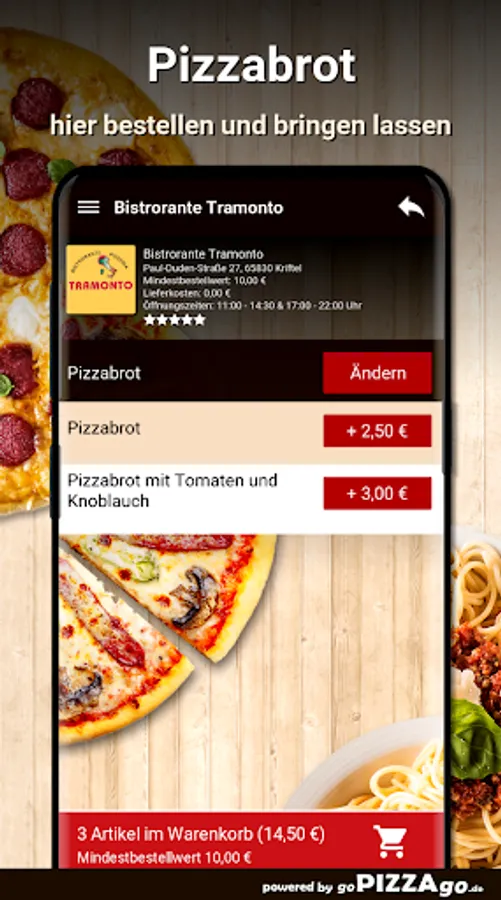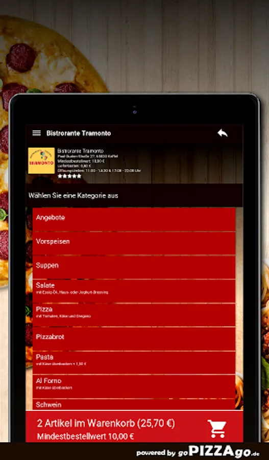 Also delicious: pizzas at the Bistrorante Tramonto delivery service A really delicious assortment of pizzas, whether with salami, mushrooms or ham, are offered to you online. Pizza Vegetaria is brought to you for € 7.50, Pizza Sofia Loren is delivered to your home or elsewhere at a price of € 7.00, Pizza Mozzarella, Pizza Funghi, Pizza Spaghetti for € 7.00.