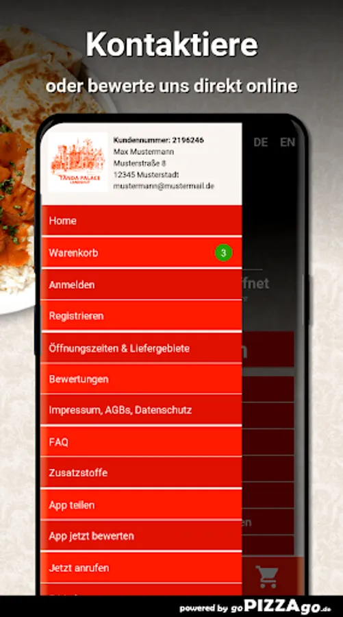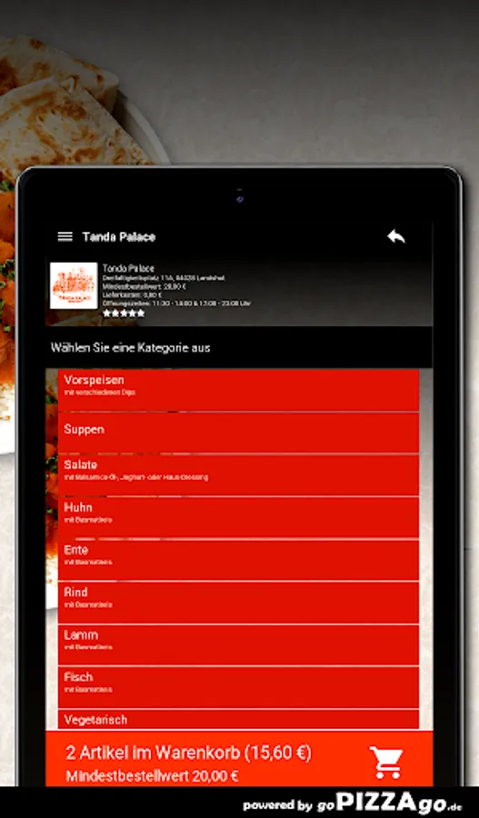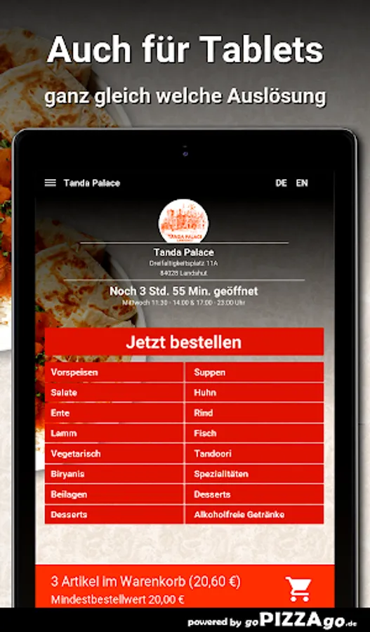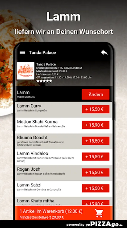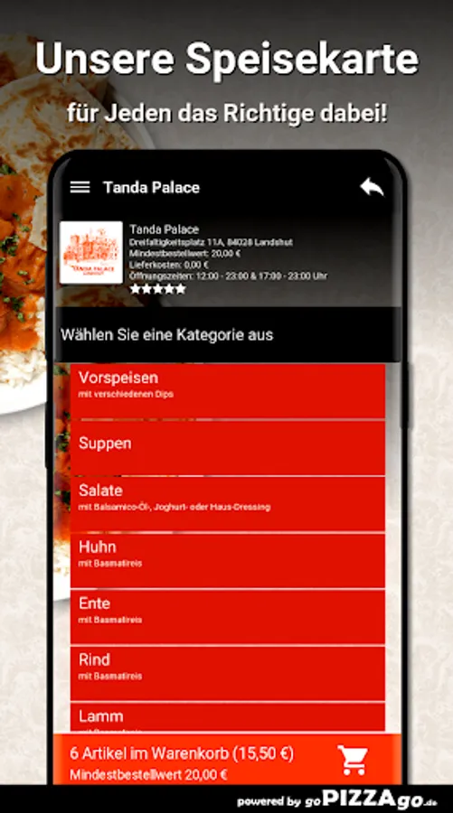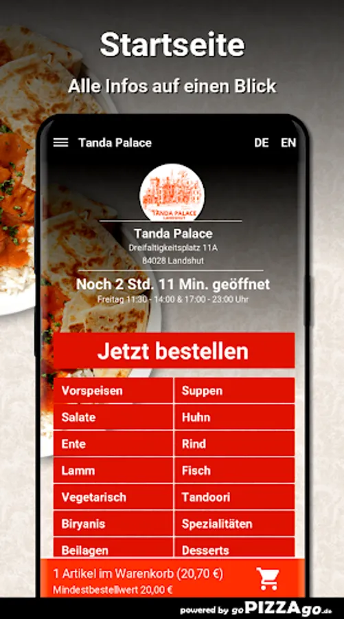 You can order delicious and fresh dishes on our website at the Tanda Palace home service (Dreifaltigkeitsplatz 11A in Landshut) and have them delivered to your office or home. The menu has a choice of 156 dishes to eat or drink, an excerpt: Murgh Shorba, Fish Pakora, Tandoori Paneer Tikka, Onion Naan, Beet Bhunna. In addition to feasts, we have thirst quenchers on offer: Sweet Lassi, Mango Lassi, Coconut Lassi, Banana Lassi, Salty Lassi, Passion Fruit Lassi.Tanda Palace Top-7Our delivery times