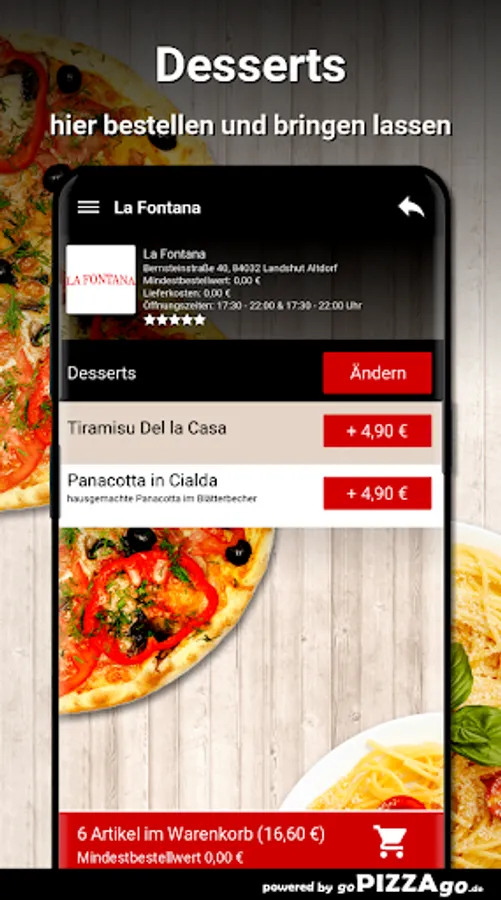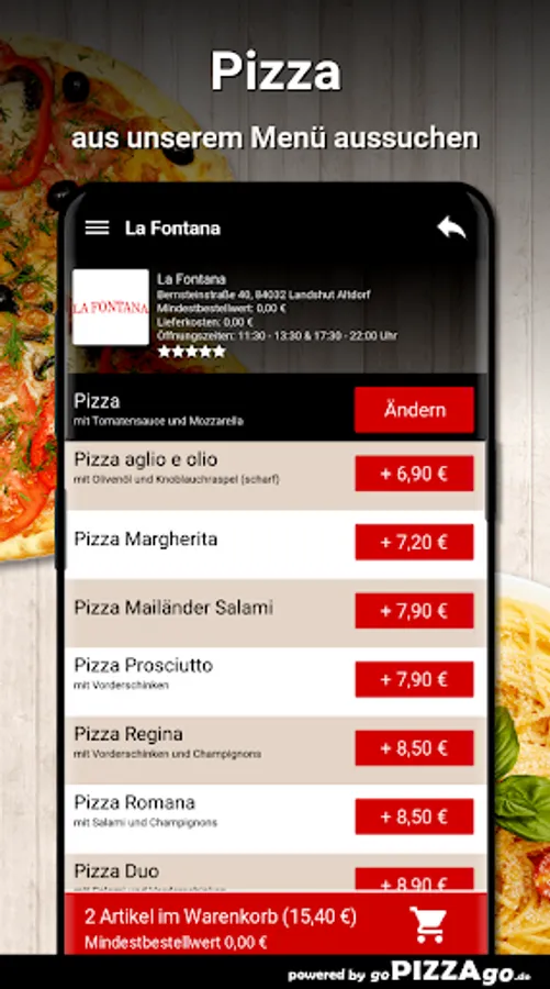 You can safely order really tasty meals in our pizza home service & have them delivered to your home or maybe even your office. We have 54 delicious dishes (Pizza Mimi, Spaghetti aglio e olio, Pizza Tonno e Cipolla, Gnocchi, Fitness Salad or Spaghetti Amatriciana for € 8.20). We also deliver soft drinks to you. We have Mezzo Mix 0.33l, Coca-Cola 0.33l, water 0.5l, Fanta 0.33l on offer.The most popular fresh dishesThe delivery times of La Fontana