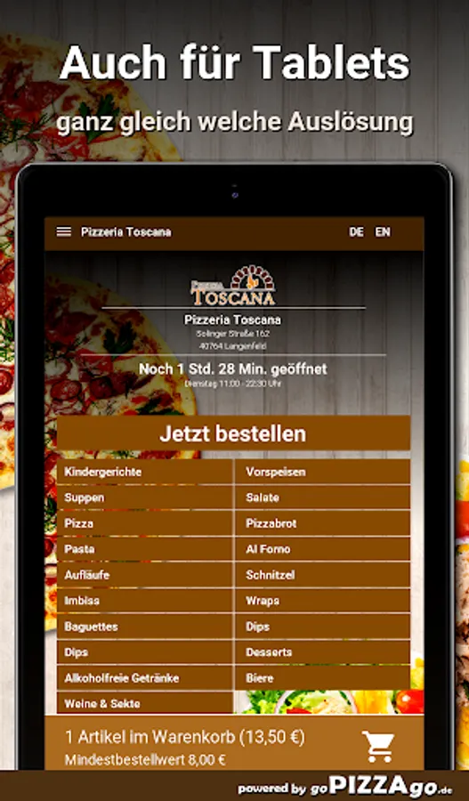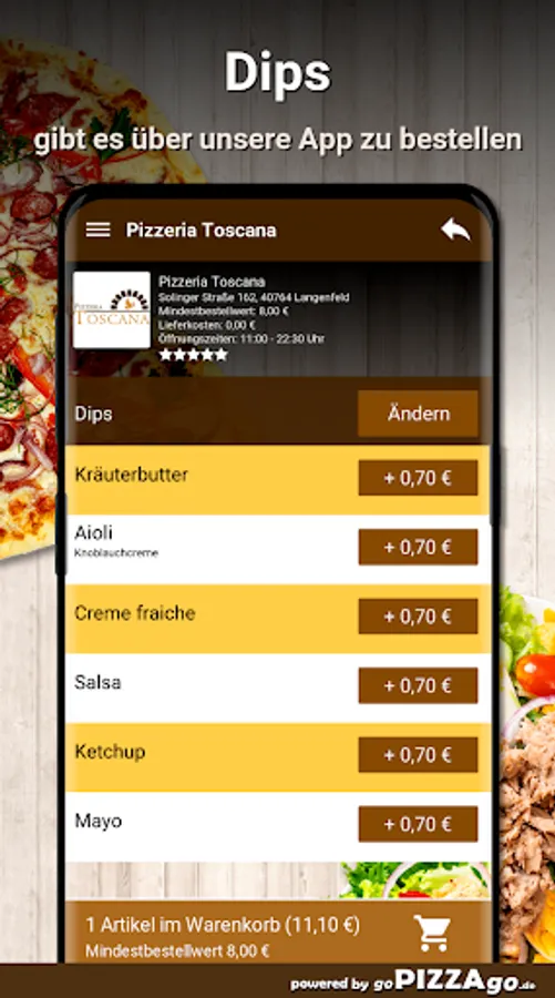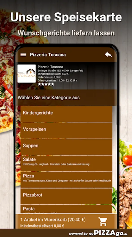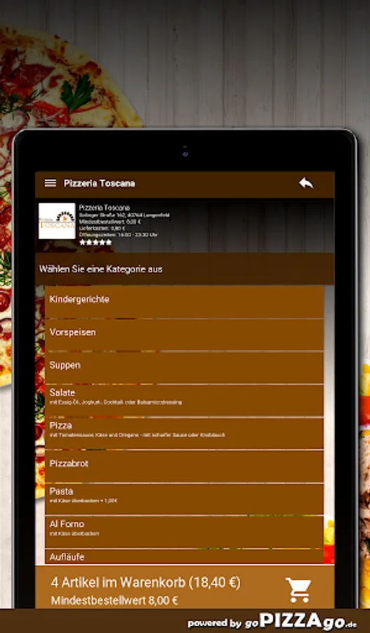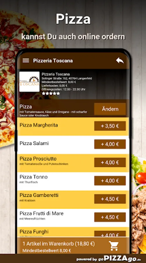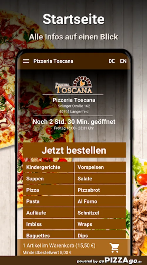 Pizzeria Toscana - order food in LangenfeldAt Pizzeria Toscana you can order snacks, schnitzel, pasta, casseroles, wraps, salads ... totally freshly prepared!
