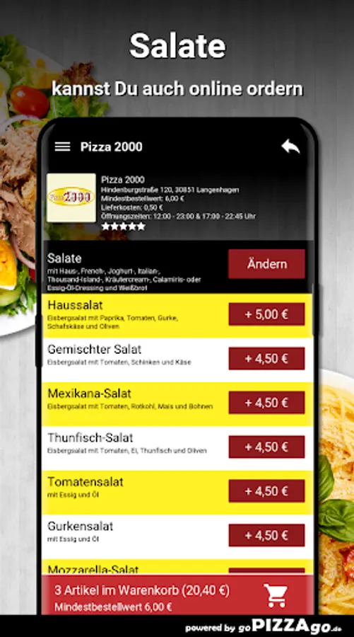 Salad tour for the health-conscious in Langenhagen? Pizza 2000 makes it possible! With Pizza 2000 you can of course also really enjoy the gourmet tasting as a salad lover. Mozzarella salad with house, French, yoghurt, Italian, Thousand Island, herb cream, calamiris or vinegar-oil dressing and white bread is brought to you for 5.50 euros, tomato salad for an amazing 4.50 euros , Young and crunchy house salad is brought to you for 5.00-7.50 euros, Mexicana salad with house, French, yoghurt, Italian, Thousand Island, herb cream, calamiris or vinegar-oil dressing and white bread, the delivery service brings you at a price of 4.50-6.50 €, absolutely delicious mixed salad for a fabulous 4.50-6.50 €, rice salad, tuna salad with house, French, yogurt , Italian, Thousand Island, herb cream, calamiris or vinegar-oil dressing and white bread can be brought to you by the delivery service at a price of 4.50-7.00 euros, you can get chicken salad at Pizza 2000 for 7, 50 €, you get shrimp salad with house, French, yoghurt, Italian, Thousand Island, herb cream, calamiris or vinegar-oil dressing and white bread for 8.00 € and a healthy sausage salad You the deliverer vice at a price of € 5.00- € 8.00.
